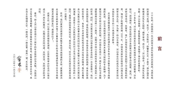 此次展览缘起是河山画会的道友们多年来与书画频道的友谊,以及书画频道对中国画学术发展与探究的专业精神。为了展现当代中国山水画的风貌,河山画会在成立30周年之际与书画频道联袂推出这样一个展览,以期对中国山水画的传承与发展起到一定的作用。同时,这次展览也是河山画会新老会员的一次全面展示,他们来自祖国各地,有高校的教授,有各地美协及画院的画家,有来自军旅的创作骨干,有各个艺术研究机构及美术出版社的精英。我们本着传承与发展中国山水画事业的共同目标力争能够让大家对此次展览感到满意。这是在十九大胜利召开以后对习总书记提出文化自信的一次践行,是将中国优秀传统文化,革命文化,社会主义先进文化具体呈现的一次展览。