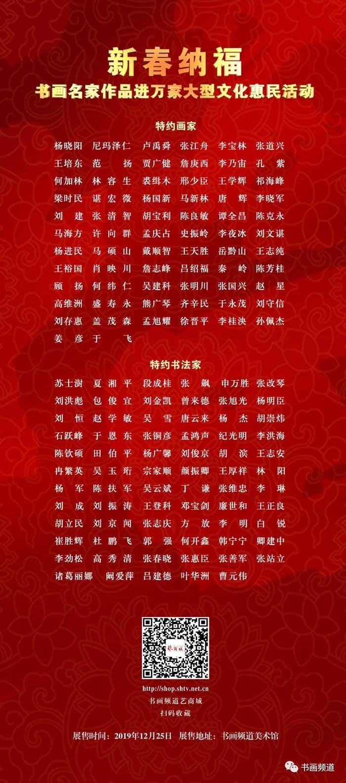 此次文化惠民活动邀请了百余位书画艺术名家参与,他们用精湛的艺术作品为惠民活动增光添彩,为人民群众奉献接地气、暖民心、有收藏价值的艺术作品,让精品力作以艺术惠民的方式“飞入寻常百姓家”,装点千万个家庭、润泽人们的心灵。这项活动起点高、范围广、意义深远,也是书画频道在春节期间推出的创新性文化活动。
