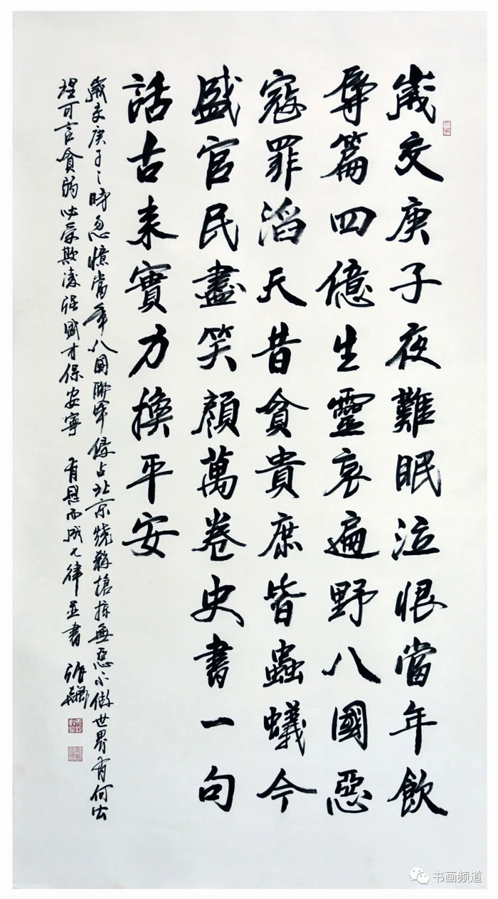 释文:七律岁交庚子有感,岁交庚子夜难眠,泣恨当年饮辱篇。四亿生灵哀遍野,八国恶寇罪滔天。昔贫贵庶皆虫蚁,今盛官民尽笑颜。万卷史书一句话:古来实力换平安