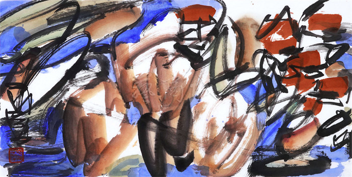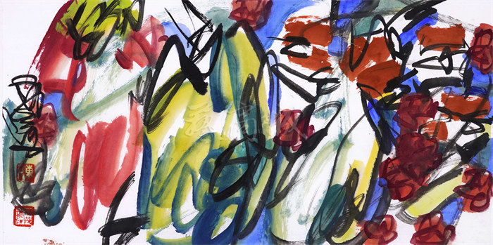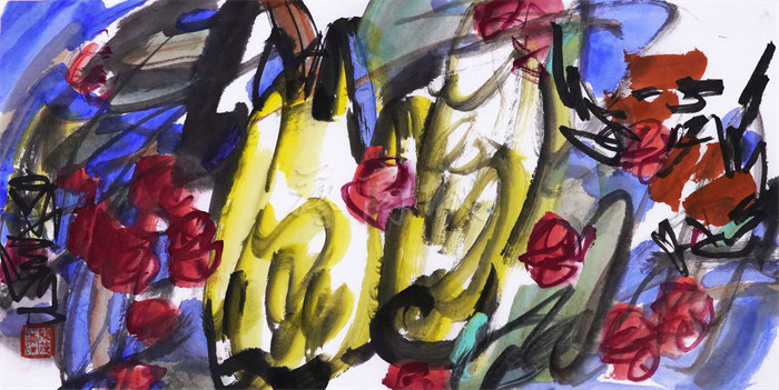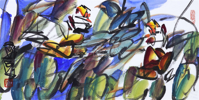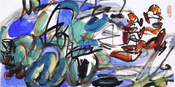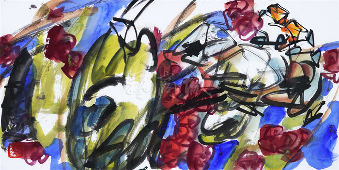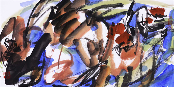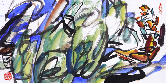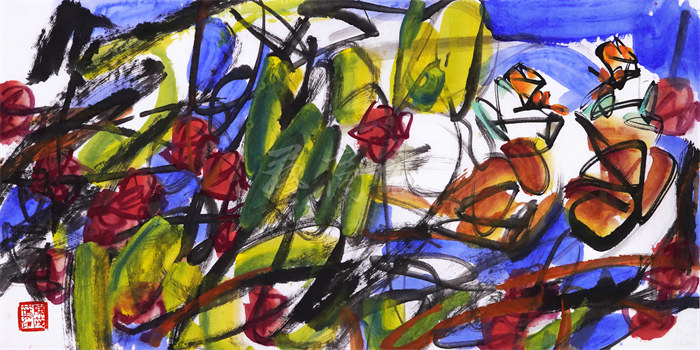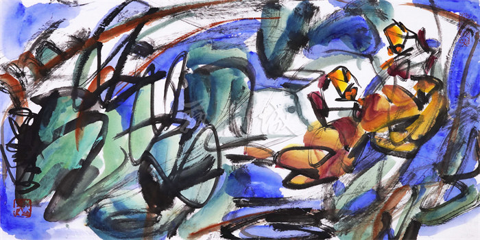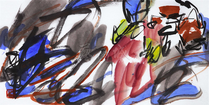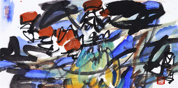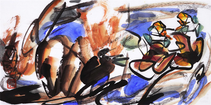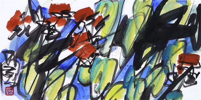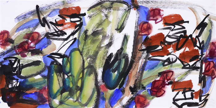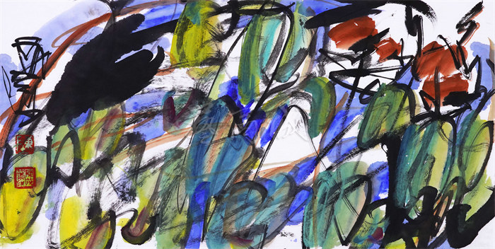 观其《无题·一》画作,粗看起来,颇有些凌乱味道,但细细看,却有一定的层次分别,在纵横交错的间隙中,看到了他冷静的艺术追求。这种味道,是陈茂叶为紧张忙碌生活着的人们,打造的温暖和闲适的境界。其作品洋溢着豪迈之情,不静下心来,很难体会其中之巧妙!