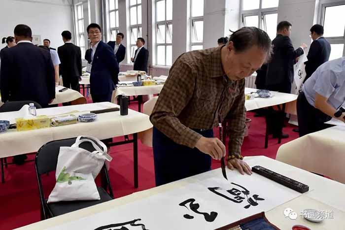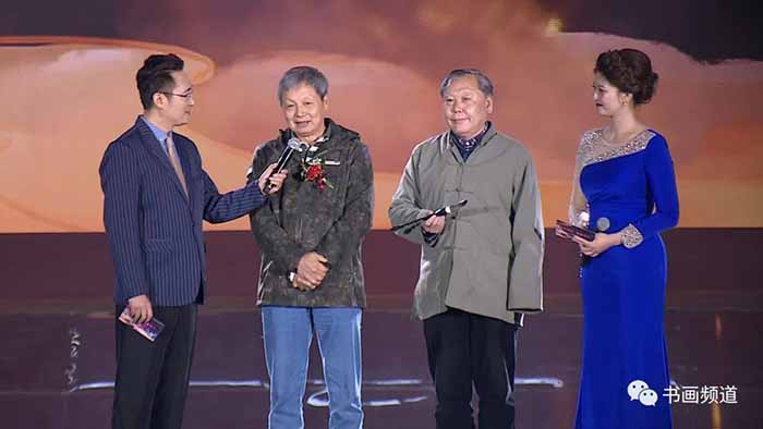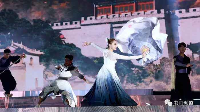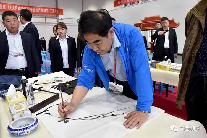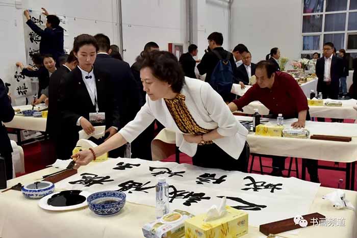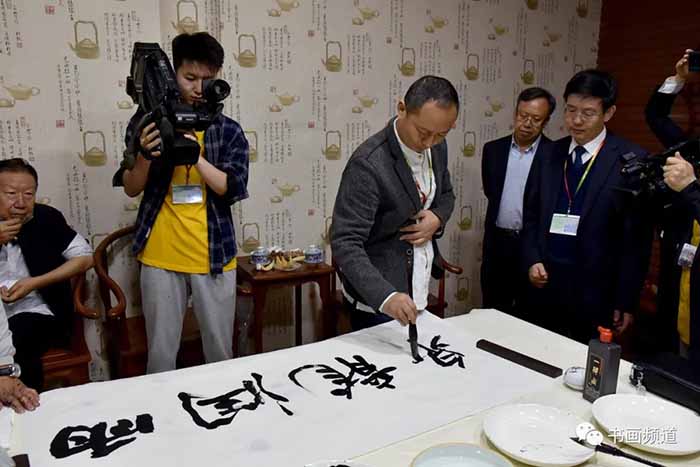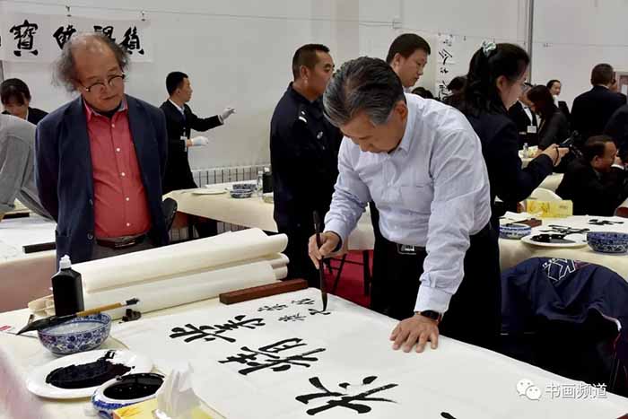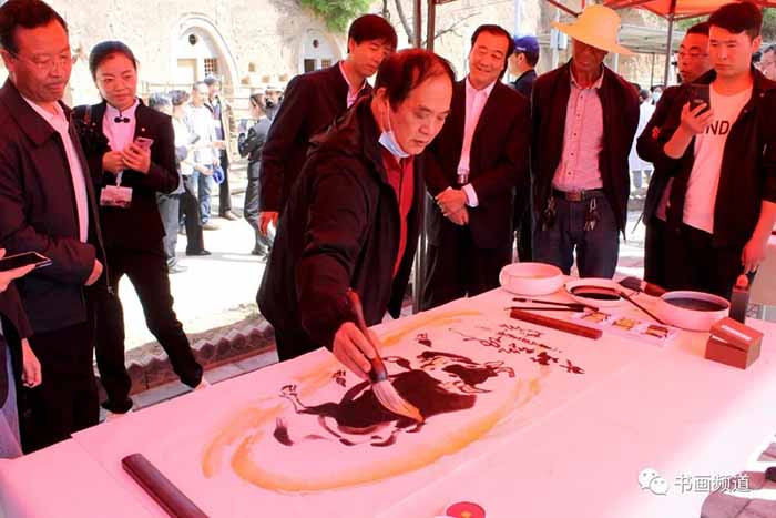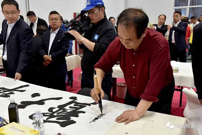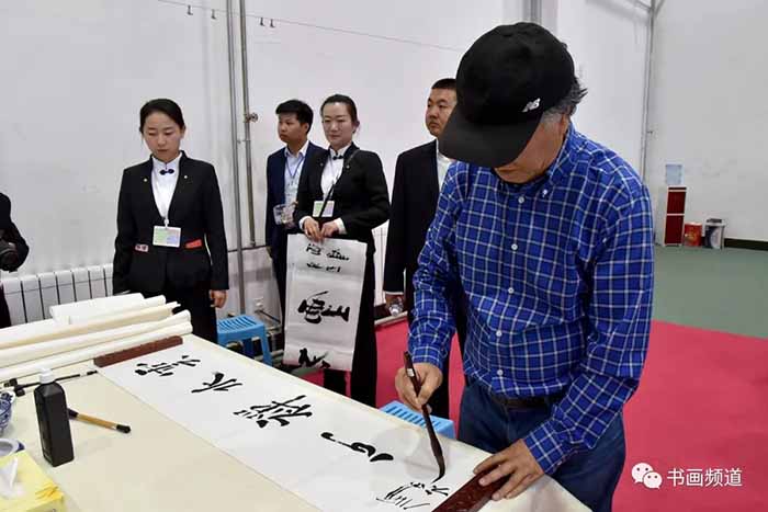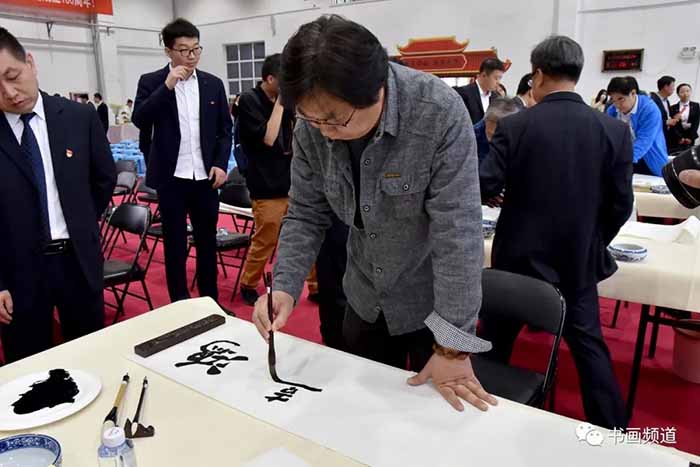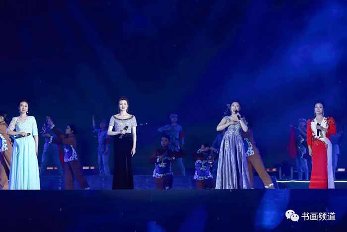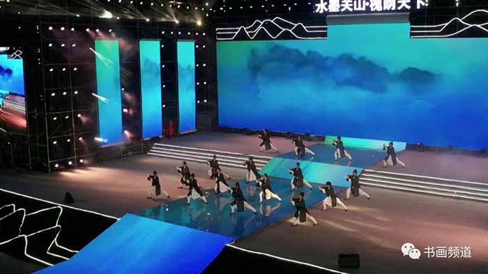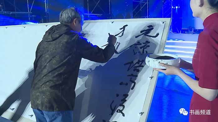 在精彩的歌舞表演中,著名书画艺术家王学辉、王利峰、谌宏微 、祁海峰、胡宝利、裘缉木、杨国新、戴顺智、李晓军、于新生走上舞台,用精彩的笔墨现场激情创作,以浑厚的画卷描绘平凉新时代的新辉煌。