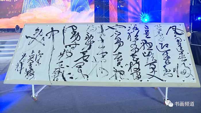著名朗诵艺术家曲敬国带来的的散文诗《魂兮,归来》,深情讲述了革命先烈保至善的英勇事迹,在动情的朗诵声中,著名书法家王厚祥、纪光明现场挥毫泼墨,创作丈二草书作品毛泽东《卜算子•咏梅》和丈二行书作品《新唐书•李元谅传》节选。