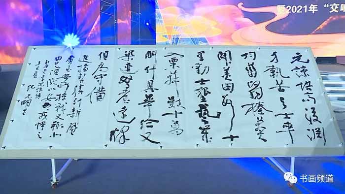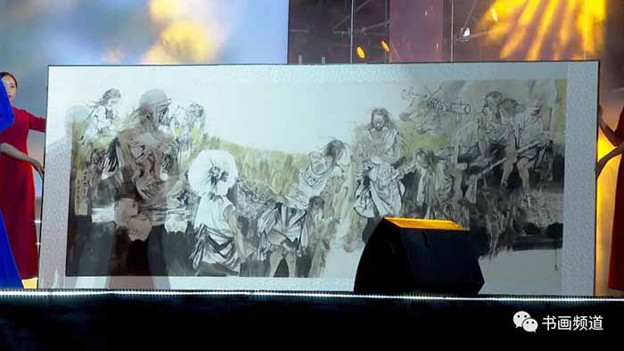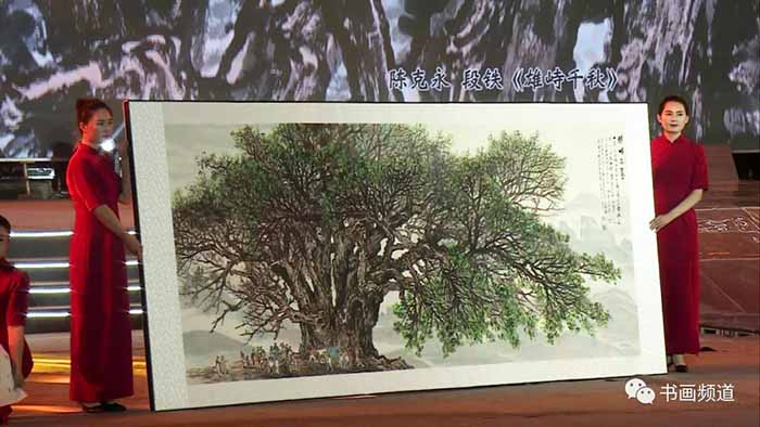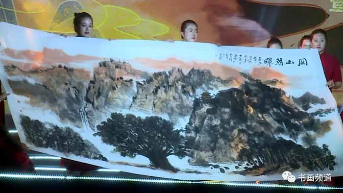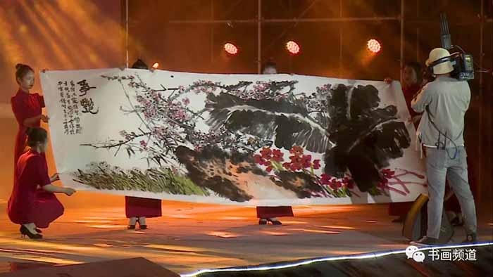 在荡气回肠、余音绕梁的朗诵声中,书画艺术家们现场通力合作创作的巨幅山水画《关山朝晖》和巨幅花鸟画《争艳》也相继完成。除现场创作外,为了生动呈现崇信大地的山川风物和历史文化,艺术家陈克永、段铁、赵星“搜尽奇峰打草稿”,专门为崇信人民创作了两幅巨幅画作《雄峙千秋》和《公刘与崇信》,四副精品巨制同台亮相,这是书画频道和书画艺术家们对平凉崇信这块土地的深情礼赞和诚挚问候。