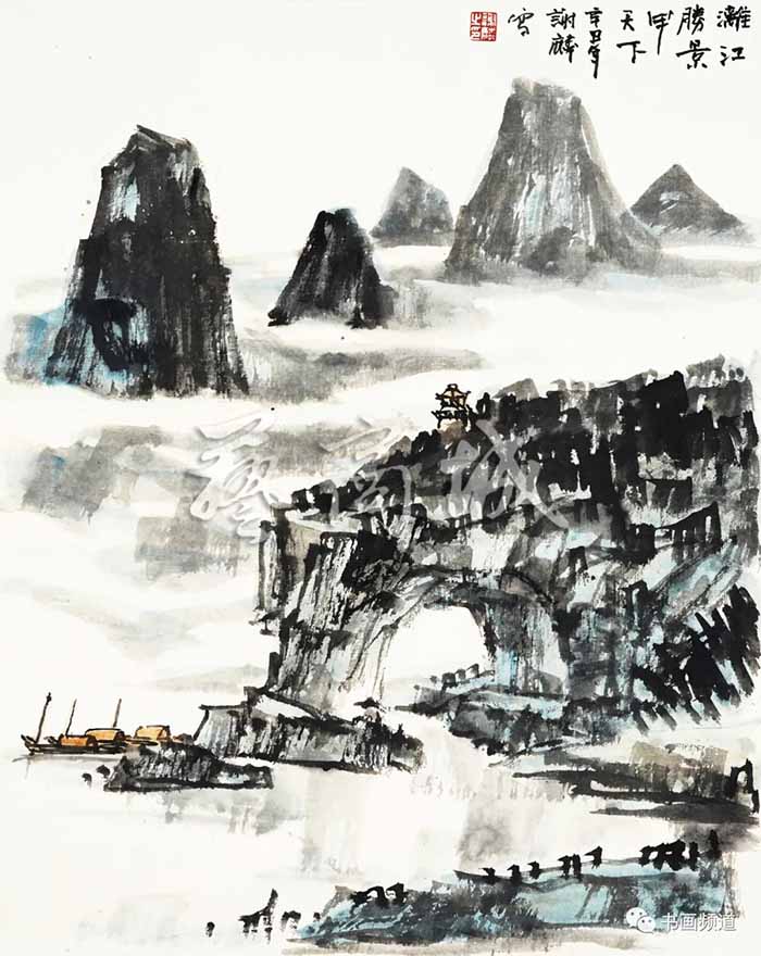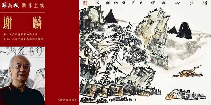 谢麟长期生活在广西南宁,是典型的南方人。他善于思考,勤于创作,有着强烈的事业心与责任心。他的山水画看似取材于广西当地的山川河流,以地域性表现为主,但又不仅仅是。恰切的说应该是谢麟自己独特审美的谢家山水,是他已经升华了的心中云烟。风格表现上虽多施以青绿色调,但又不局限于青绿,而是笔线硬朗、水墨淋漓,青秀雅致的效果更为鲜明。