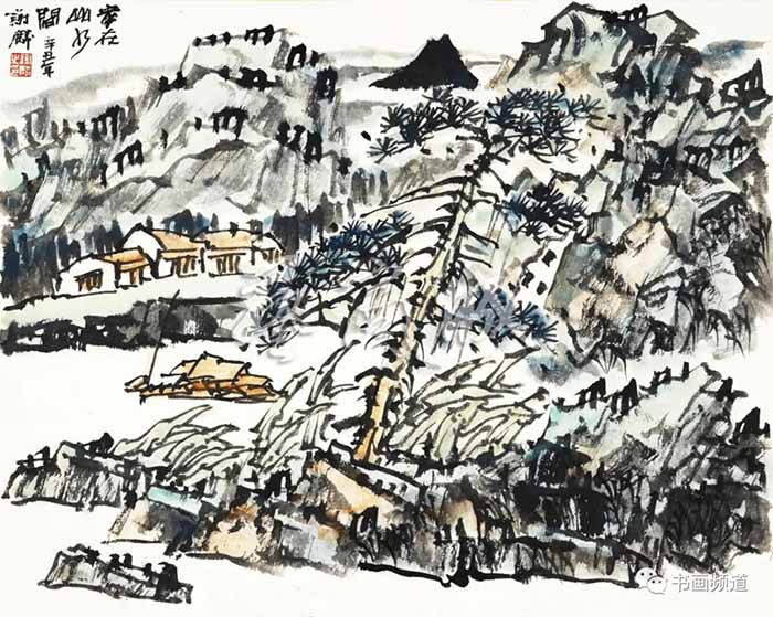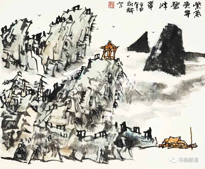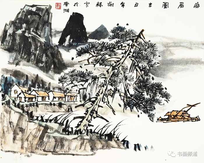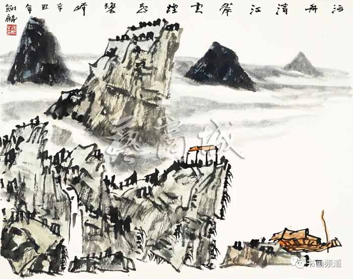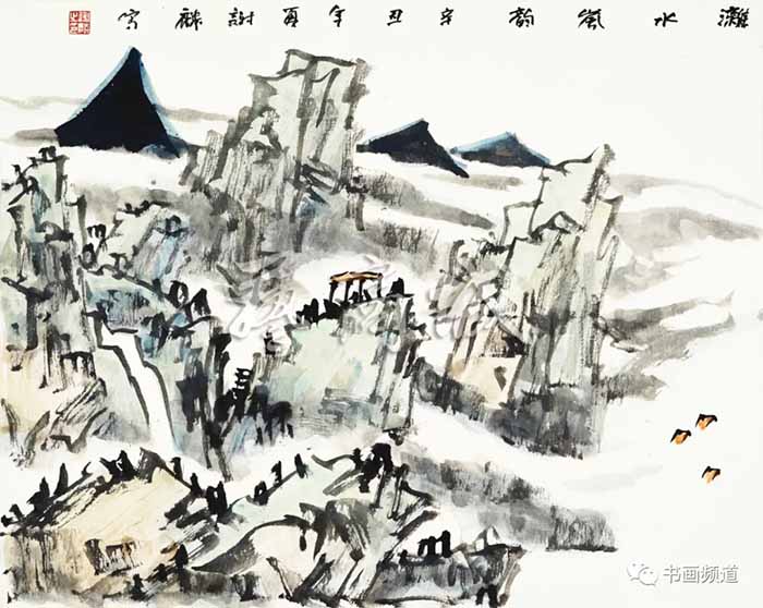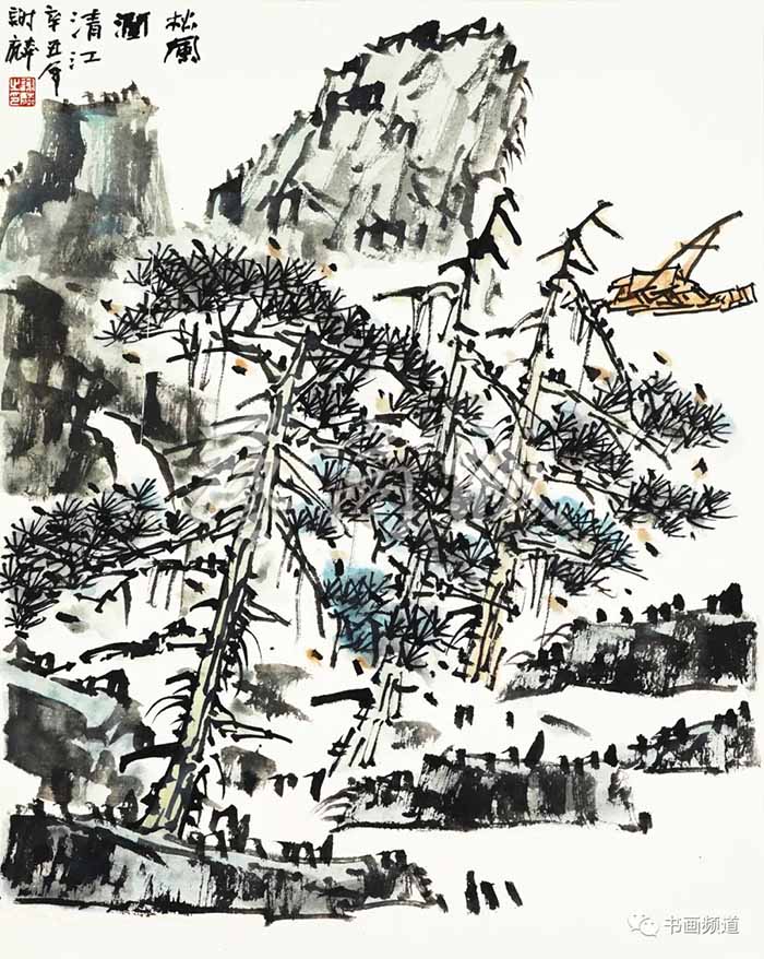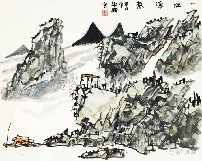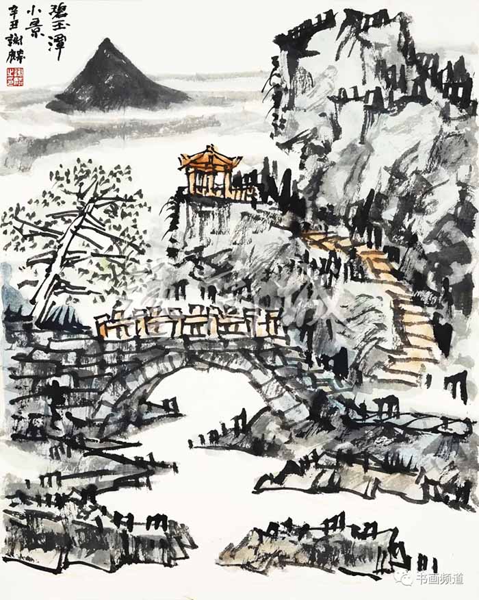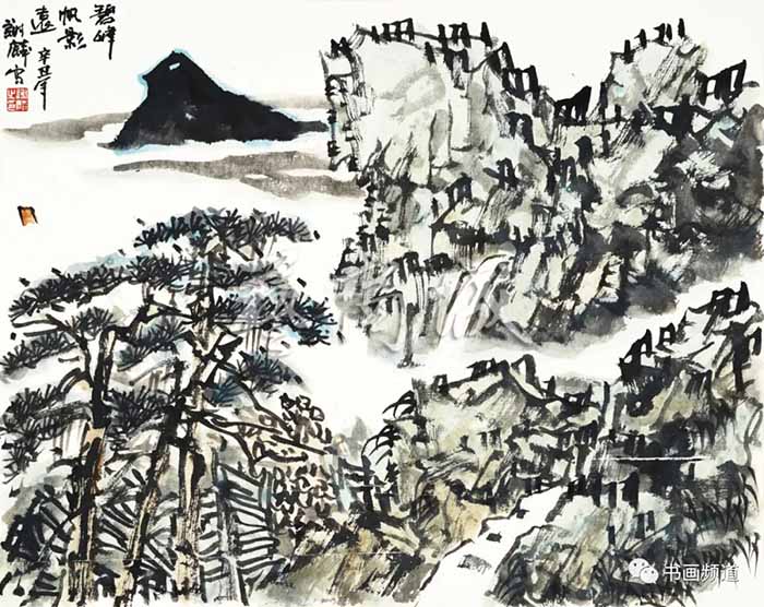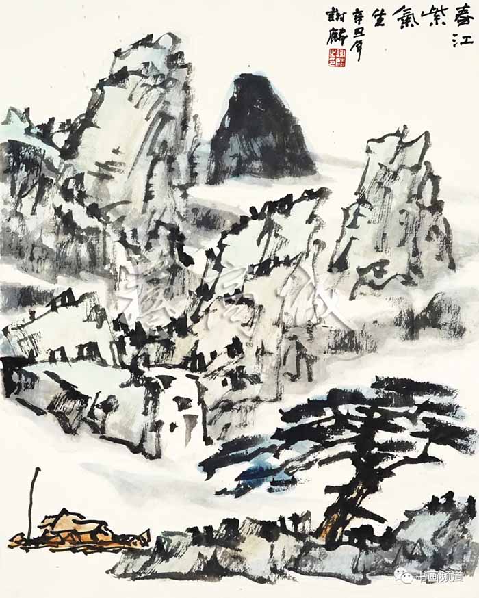 谢麟的山水画作品,画面结构布局整体统一,开合有度,同时有一种很强的气势与节奏感。笔墨酣畅,墨色淋漓,浑然一体,山石与树木、行云与流水之间展现出强烈的凝聚力,形成他山水画的典型图式。