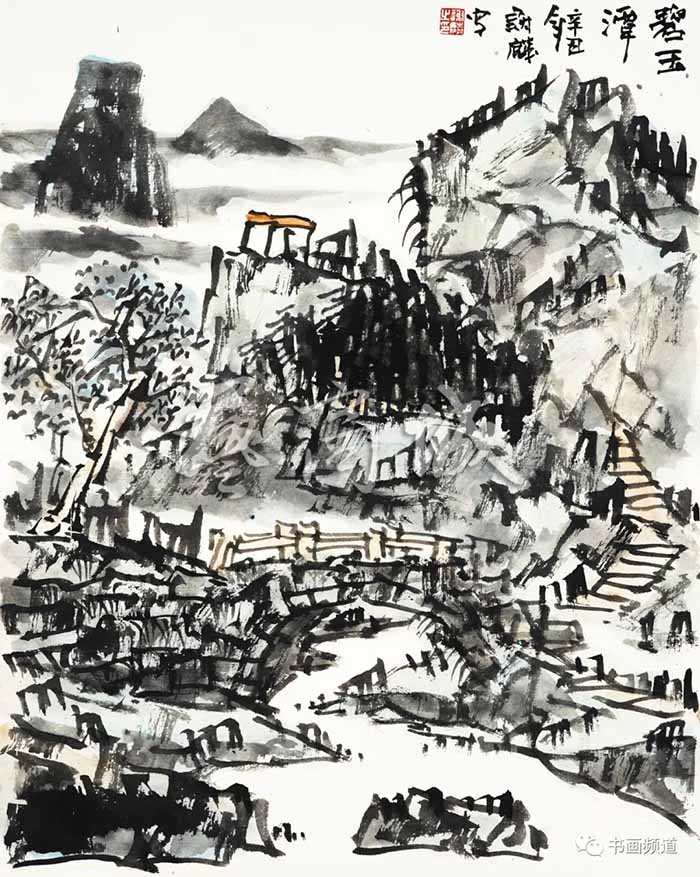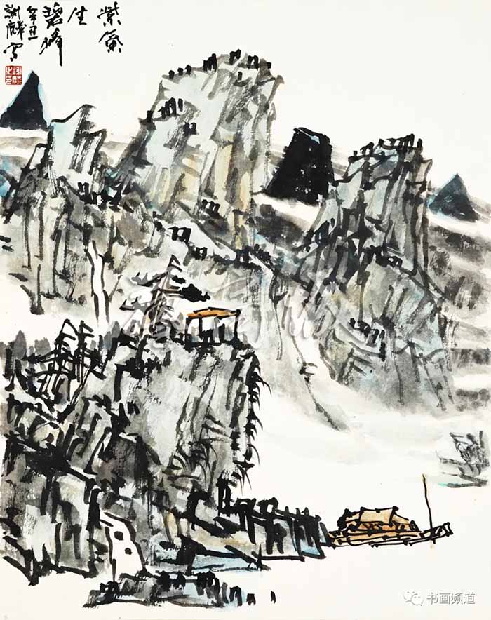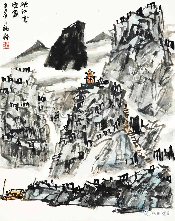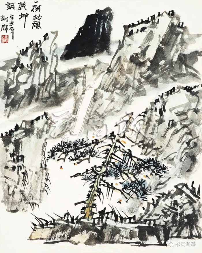 谢麟的山水画有几种基本的元素,山石、树木、瀑布、飞泉、行云与流水这些传统符号,他画面的笔墨、结构有着鲜明的特色,山石为不同的三角形组合,皴法为大刀阔斧式;树木是他自己独特的拟人化了的形态,似是枯树而又坚挺倔强,富于生命力,预示着顽强的精神;瀑布、留白、行云与流水则带有强烈的音乐感。