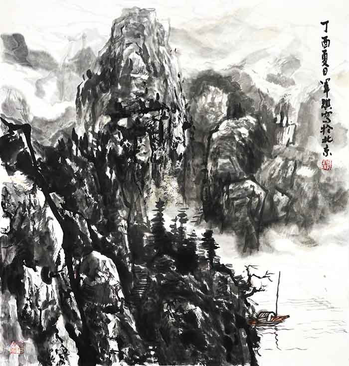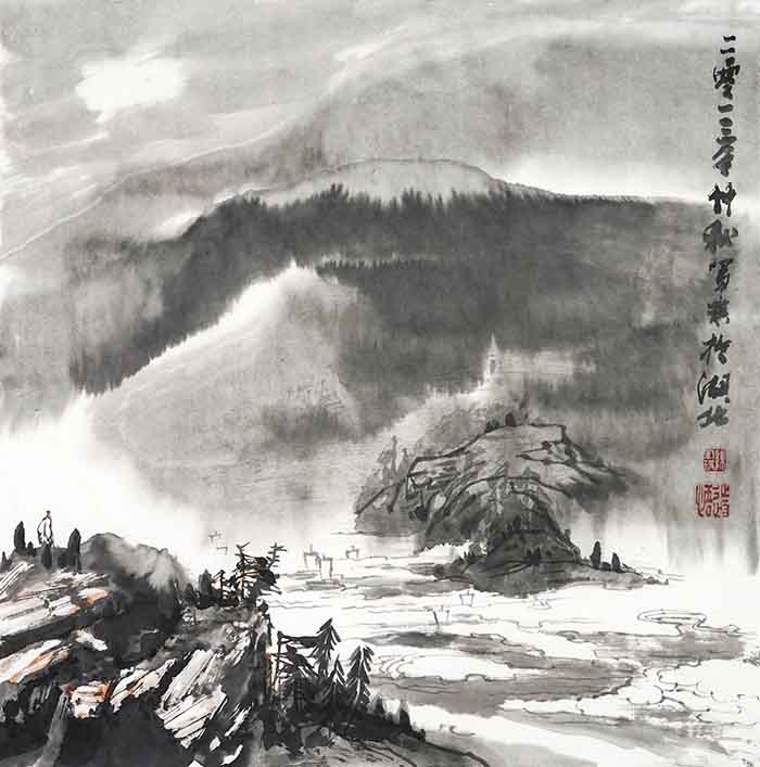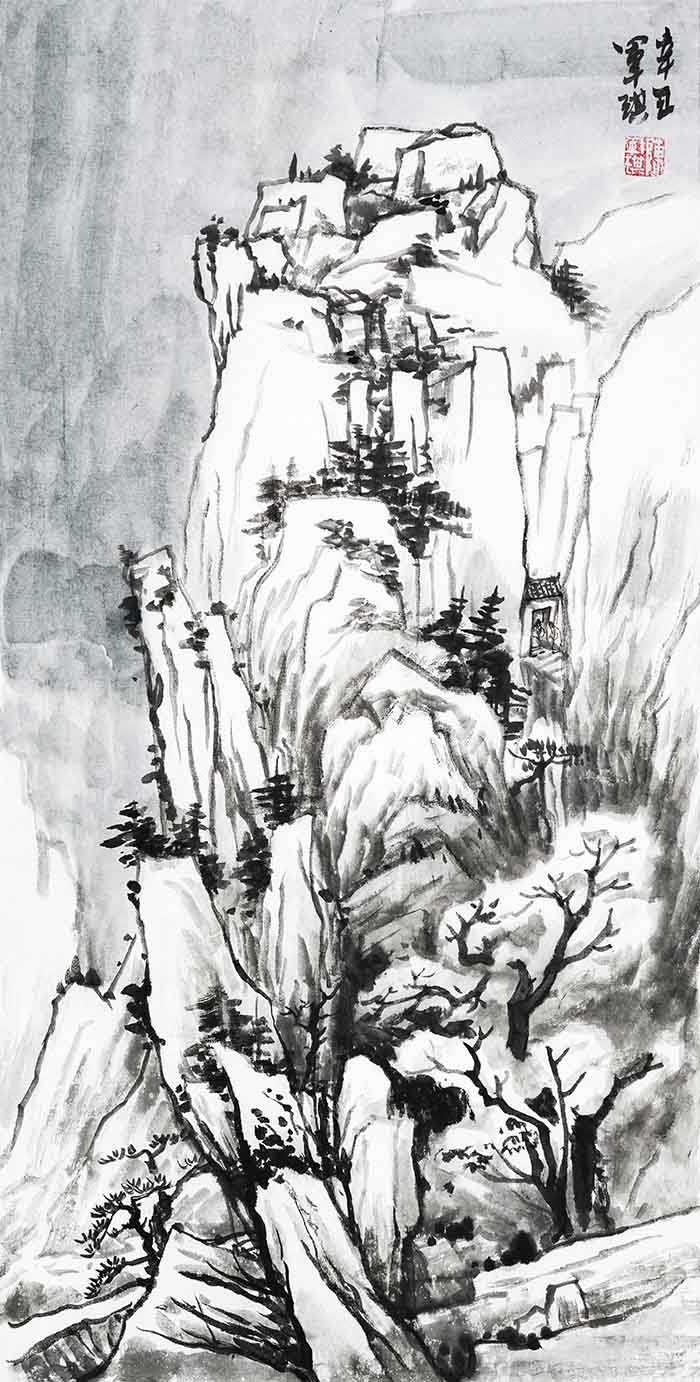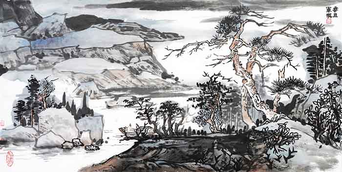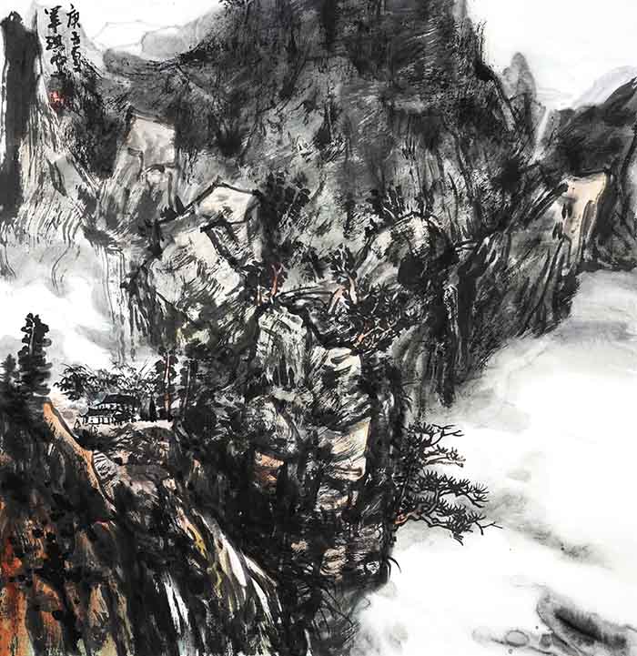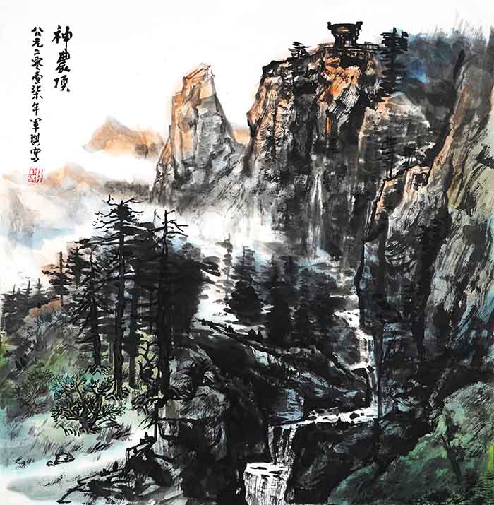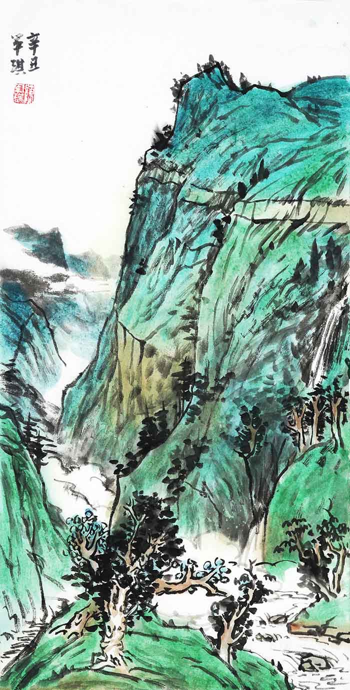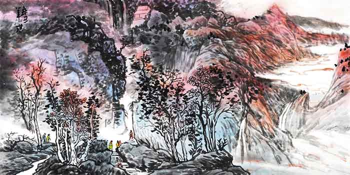 品读陈军琪的作品,能够感受到一种来自故土的情思,他从小生活在中华文化底蕴深厚的道教圣地——武当山脚下,在这里寄托了他的情思,这里是他艺术创作的源泉。武当山,除了那些仙境般美丽的群山之外,更多的还有山中文化的意义。如他在《松下听泉图》中表现的那样,山顶崖角上一抹的金光映射进下方静谧的山谷,由于光影的错动,本是翠色的山顶被映照成了紫气东来的颜色。这一抹光是朝阳还是夕辉,艺术本身不在于什么时候,而在于画面传达给人的感受。高山仰止而又不会觉得神圣的不可接近,山顶上是仙界,山脚下便是农家。