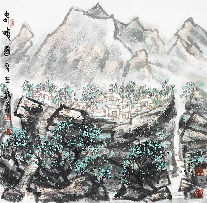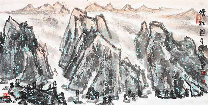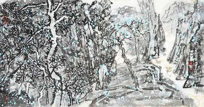 梁振华的山水画创作衷情于对中国画笔墨的表述,同时将西方的绘画理念融入其中,从而在绘画语言上进行着融汇中西的探索。梁振华以浓厚富于变化的墨色与明快单纯的色彩交融,单纯中蕴含着强烈的、不可压抑的生命力量、一种生命本体的冲动。梁振华的山水画,显然也是一种兼容,他一方面在意境上汲取了传统范式的中和与冲淡,另一方面也在形式上融合了现代构图的饱满与充实。