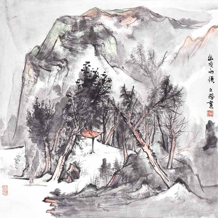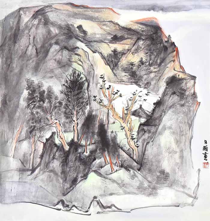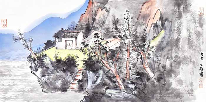 在本次左文辉创作的山水作品中,画面采用展开式构图,远山近水,空间开阔,重峦叠峰,层次清晰,茂林佳树,历历在目,虽然有许多江南山水常见的景物,但已经奕破了“小桥流水人家”、“杏花春雨江南”的小格局,呈现出类似“塞下秋来风景异” 、“千嶂里,长烟落日孤城闭”的大境界,带有北派山水的高峻雄浑气势。