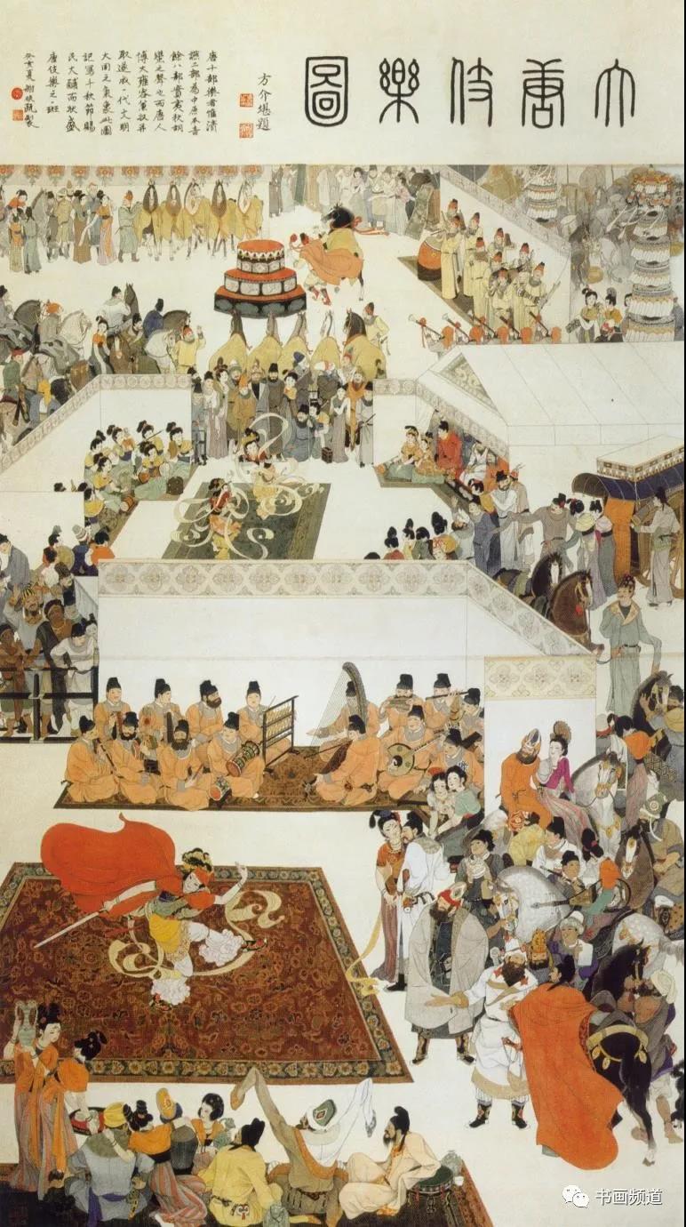 谢振瓯的《大唐伎乐图》也是第六届全国美展中涌现出的佳作。作品继承并发扬了传统工笔人物画的绘画风格,在画面空间表现方面以线造型,以意取形,叙事流动,具有传统工笔人物画空间表现的意象性特点,显示出布置意象的非凡能力,场面宏大,具有崇高的审美之境。