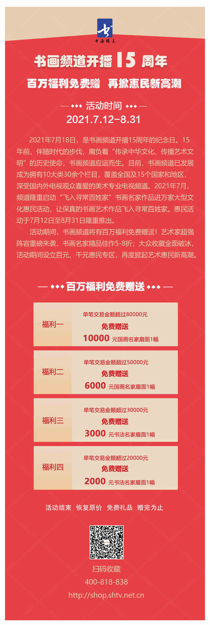 作为的一家专门从事书画艺术的专业电视频道,书画频道以维护艺术品市场秩序、营造透明诚信的艺术品消费环境为己任,努力促进文化创意产业链条完善,加强艺术版权保护,维护每一位观众、藏家和艺术家的权益。