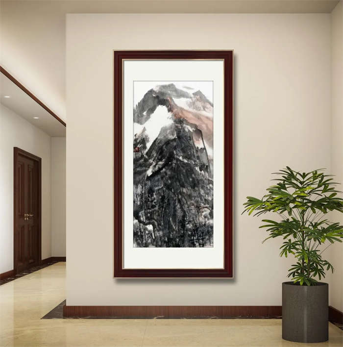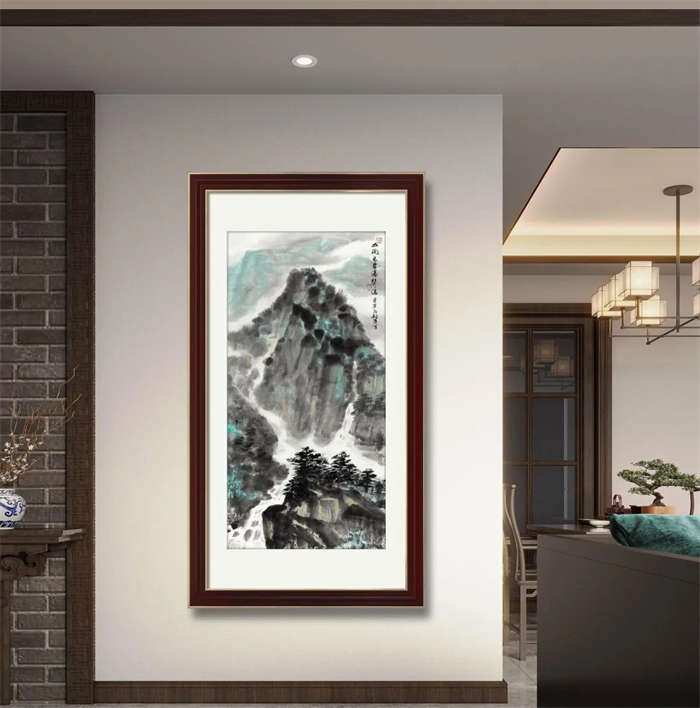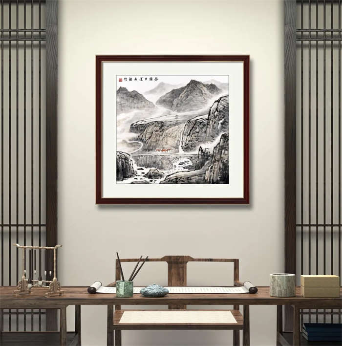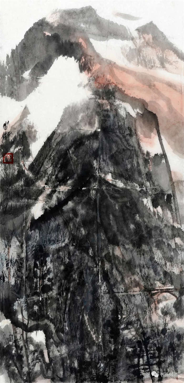 谢麟的山水画作品,画面结构布局整体统一,开合有度,同时有一种很强的气势与节奏感。笔墨酣畅,墨色淋漓,浑然一体,山石与树木、行云与流水之间展现出强烈的凝聚力,形成他山水画的典型图式。