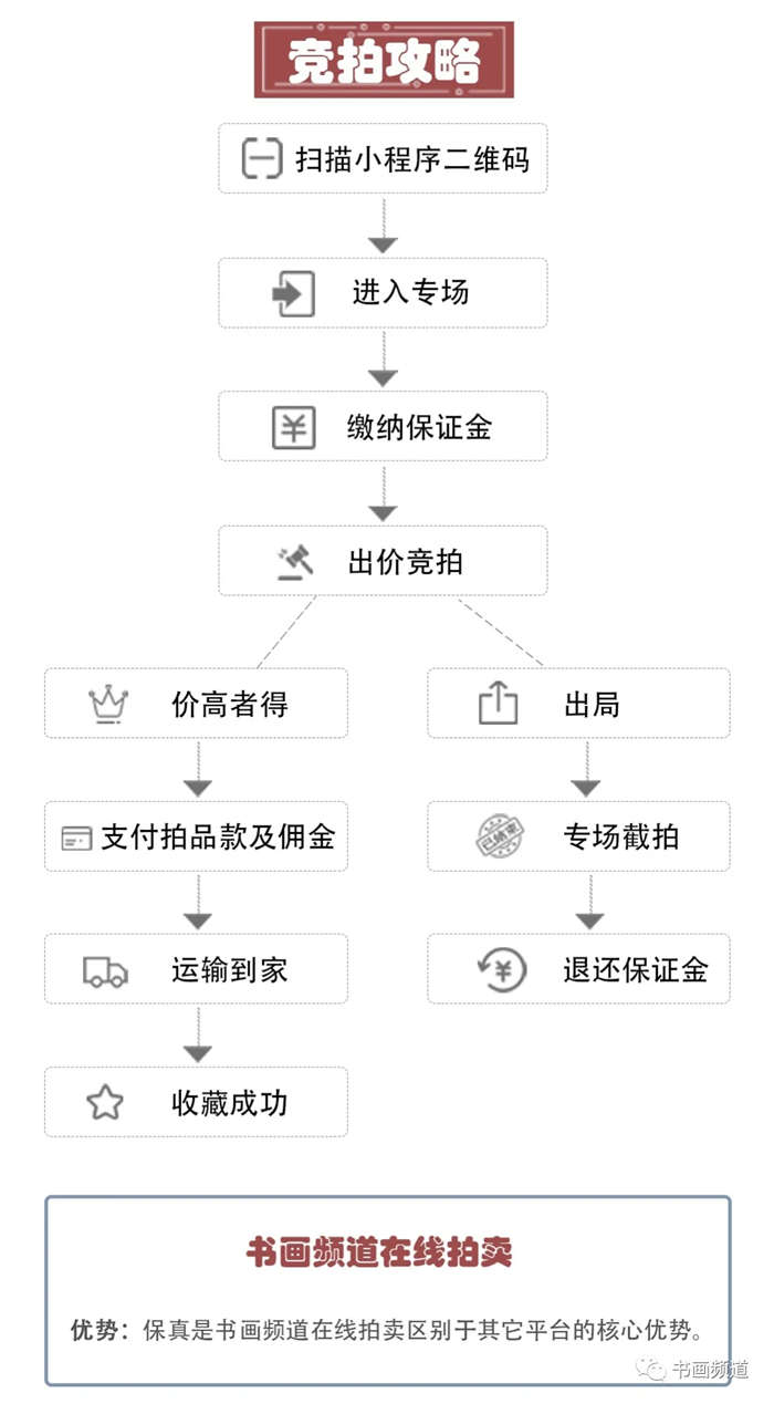 书画频道网络拍卖平台自2020年9月上线以来,得到全国各地优秀艺术家和收藏家的广泛支持与关注!面对乱象丛生的艺术品市场,书画频道肩负社会责任与时代担当,在业界高举艺术品保真旗帜,本着为藏家终身负责的诚信原则,立足学术,打造高端艺术品收藏平台,全心全意为用户服务,彻底为用户解决从艺术品流通的信任危机,为规范行业秩序起到了引领带头作用。