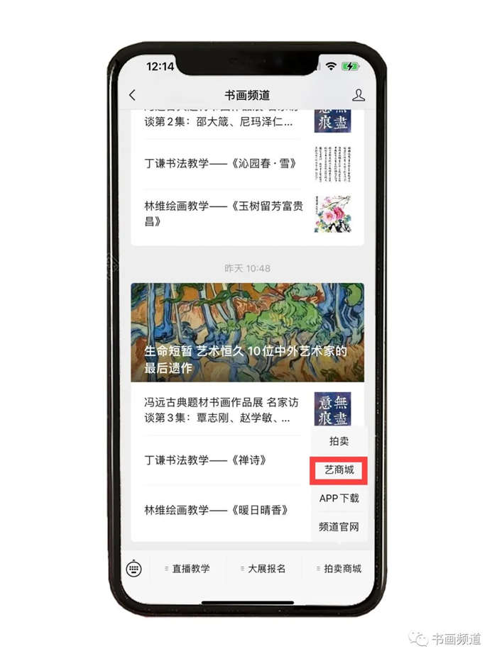 1.点击书画频道公众号右下角“拍卖商城”,选择“艺商城”进入手机端界面。