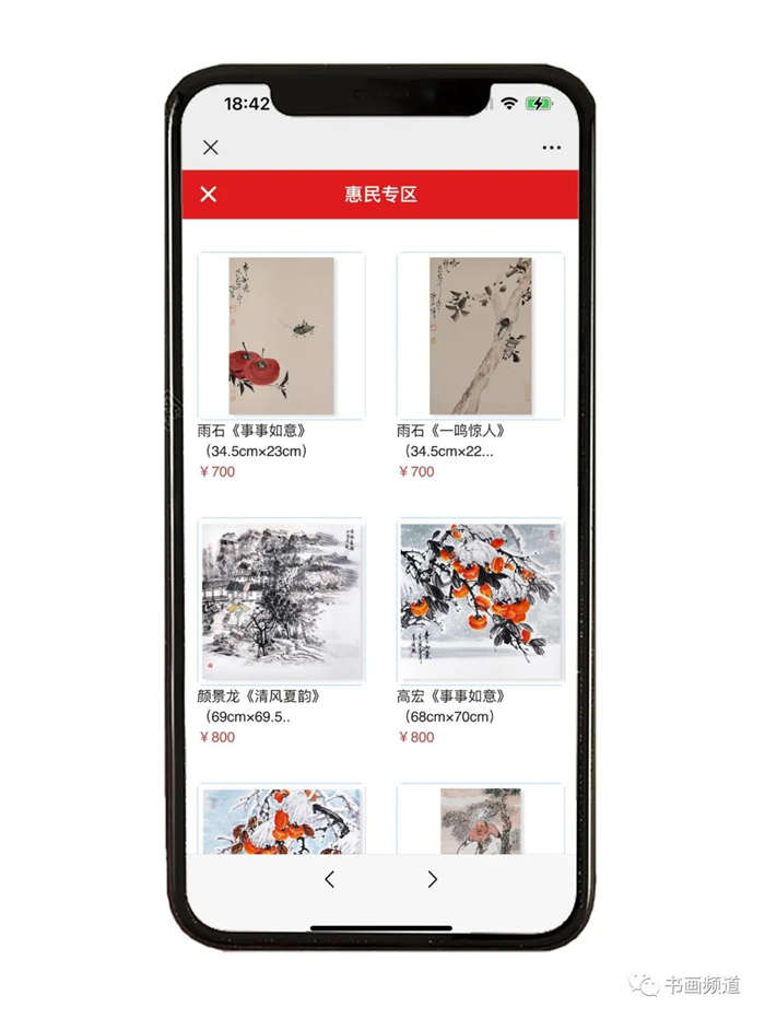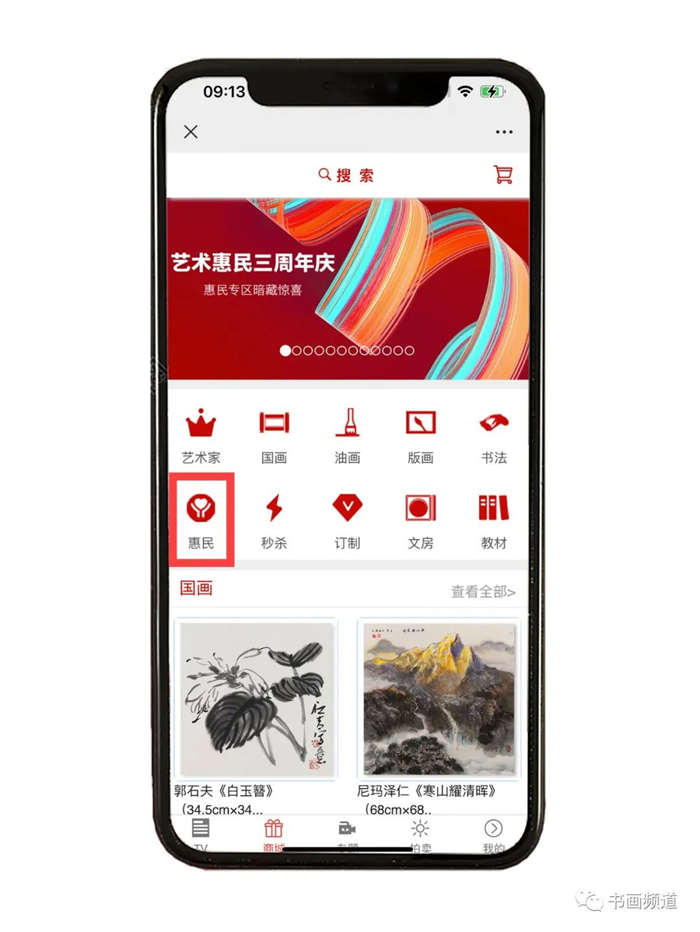 2.“艺商城”首页导航栏点击“惠民”按钮,进入书画藏品选择。
