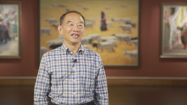 受疫情影响,韩玉臣未能亲临现场,只能以视频方式表达对主办方波拿巴宫和策展人,以及与会嘉宾的感谢;简要介绍了自己钟情西藏题材,潜心进行油画创作的缘由;讲述了自己不畏艰辛、不惧风险,先后十几次到西藏采风写生的难忘经历。