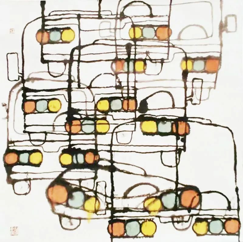 汽车、电线杆、红绿灯等城市元素皆能入画,点线面的构成运用巧妙,这些反映城市生活的新作大大拓展了传统花鸟画的表现内容和形式。