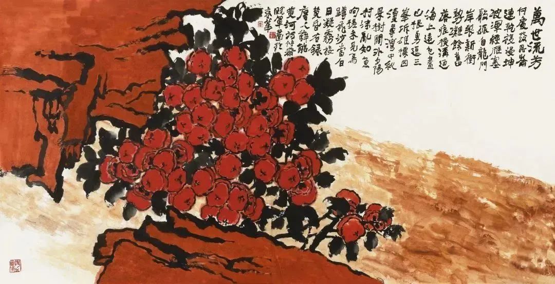 在他的绘画创作中,毫无矫揉造作和甜俗之气,取而代之的是浓厚的金石意趣,彰显了少有的雄壮浑厚的气势。