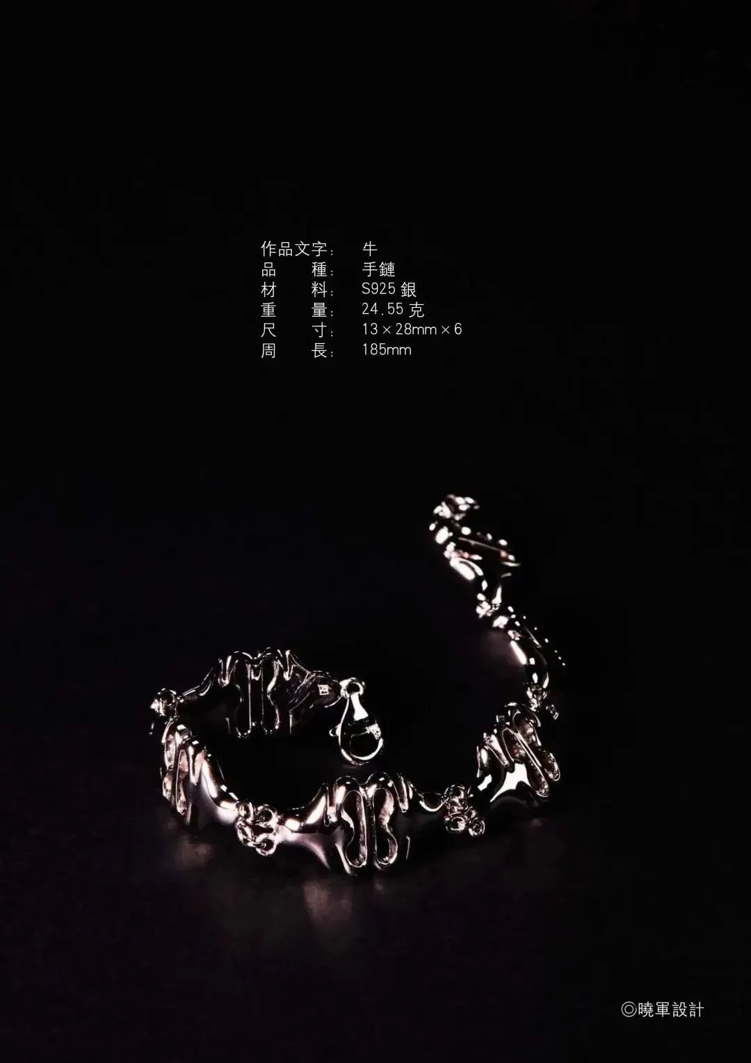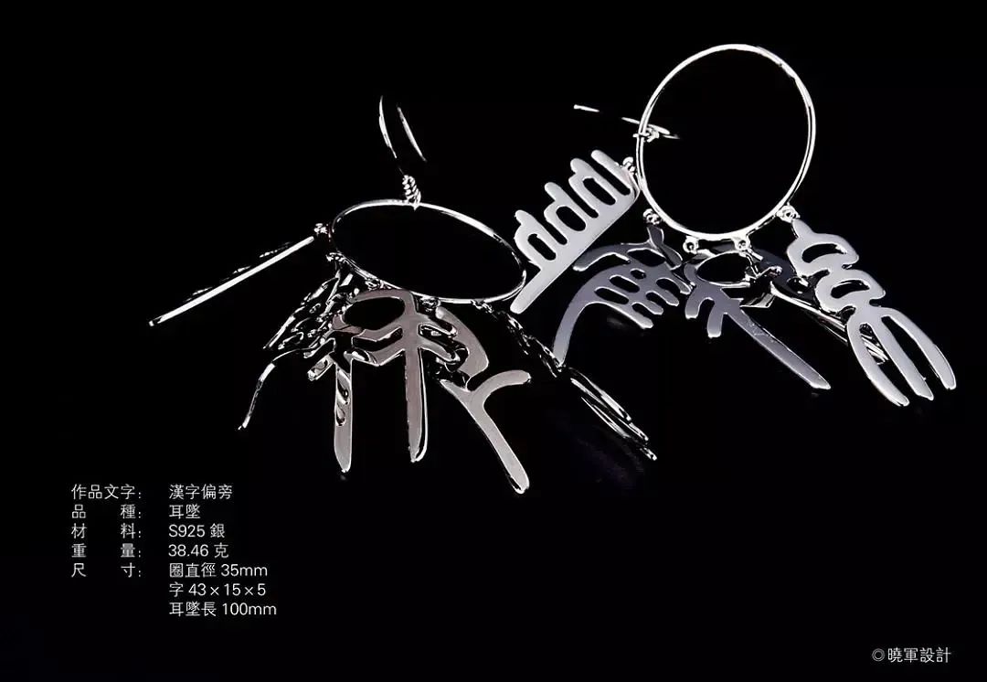 他将书法中的“折钗骨”美学概念在饰品设计中得以还原与再现,金属与汉字碰撞而出的独特美感,使传统的书法从纸面上的线性审美焕发出新时代的光芒。