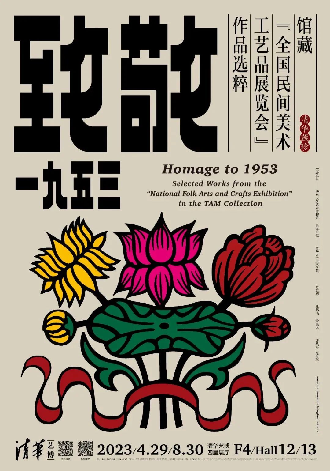 “致敬1953:馆藏‘全国民间美术工艺品展览会’作品选粹”展览,展品基础与学术脉络均源于1953年的“全国民间美术工艺品展览会”。展览从清华大学艺术博物馆藏的1000余件套“全国民间美术工艺品展览会”展品中选出170余件套。加之展览说明书、明信片、纪念章及张光宇的设计图、图书文献和研究图表等,共计约200件套展品。展品既有造型雅致,工艺精湛,图案精美的民间收藏或组织选送的作品,亦有造型朴拙、聚焦日用、工艺朴实的民间市集收购的产品。