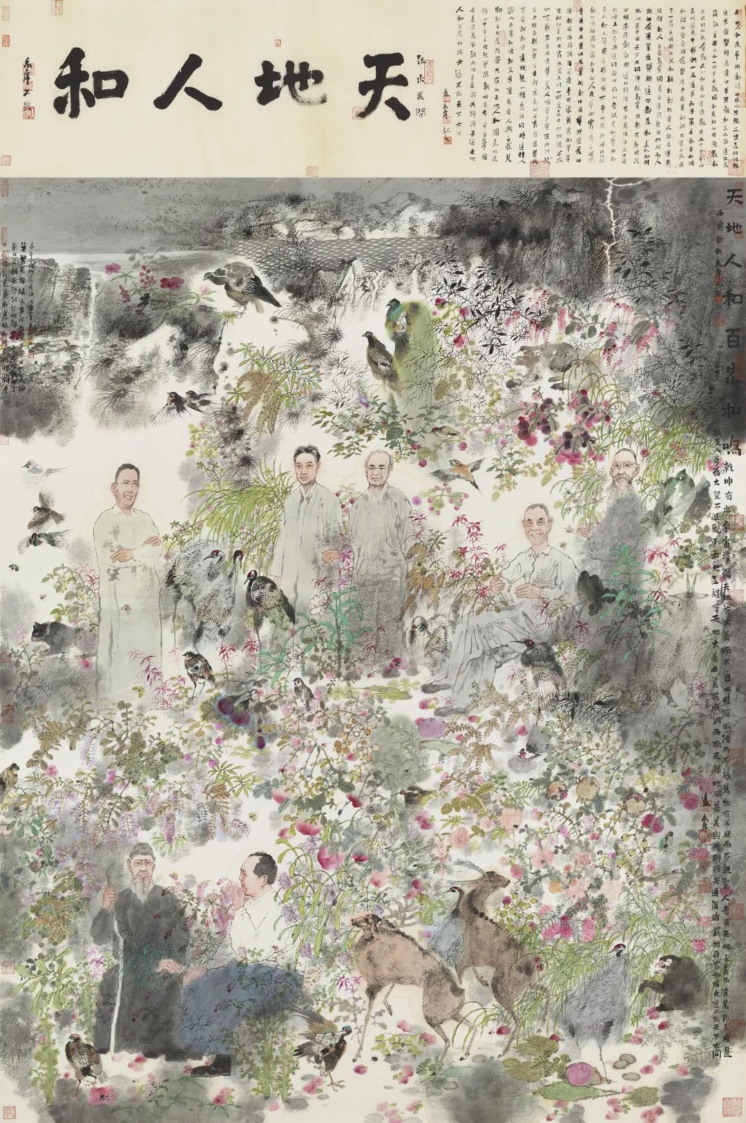 依我的理解,问道的路径有千万条,但在大道的顶峰上,则是殊途同归的,所以,我在作品中,也把毛泽东这样胸怀“太平世界,环球同此凉热”的领袖人物,与倡导和平的人民艺术家齐白石,与会通中西、兼收并蓄、推动中国艺术发展的傅抱石、徐悲鸿、潘天寿、李可染、黄宾虹等20世纪的美术大家并置在同一时空中,他们“德不孤,必有邻”,屈原用香草、美人喻君子、贤臣,他们也有各种各样的带有吉祥寓意的花树、鸟兽、草虫等簇拥、相伴,这既是一种象征,同时这种人与人平等和睦、相互尊重包容、人与自然万物相生相长、共荣共存的天地人和图景也正是我心中理想的写照:乾坤有序、宇宙无疆,天祥地瑞、各美其美,百家和鸣、美美与共,大道不孤、天下大同……