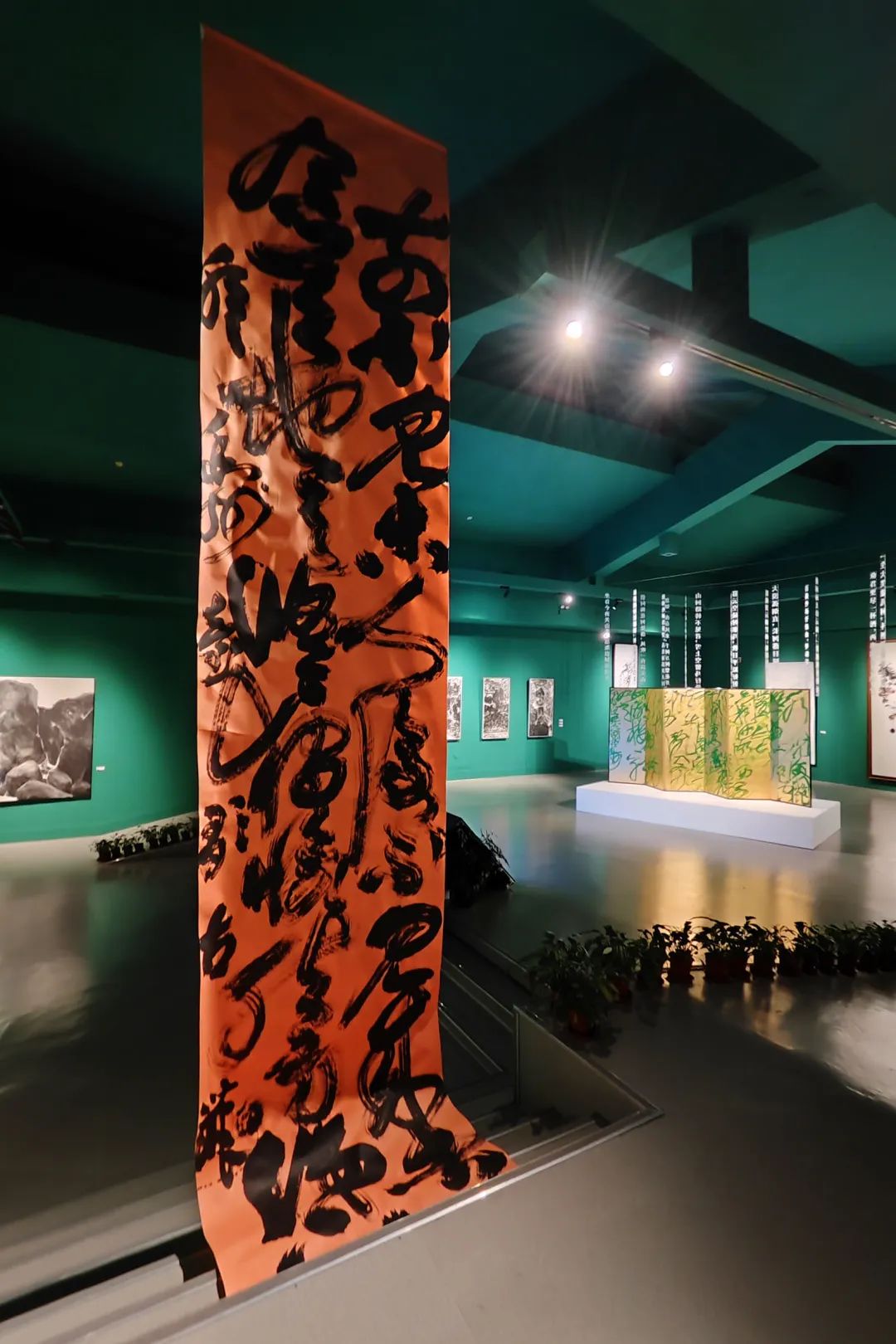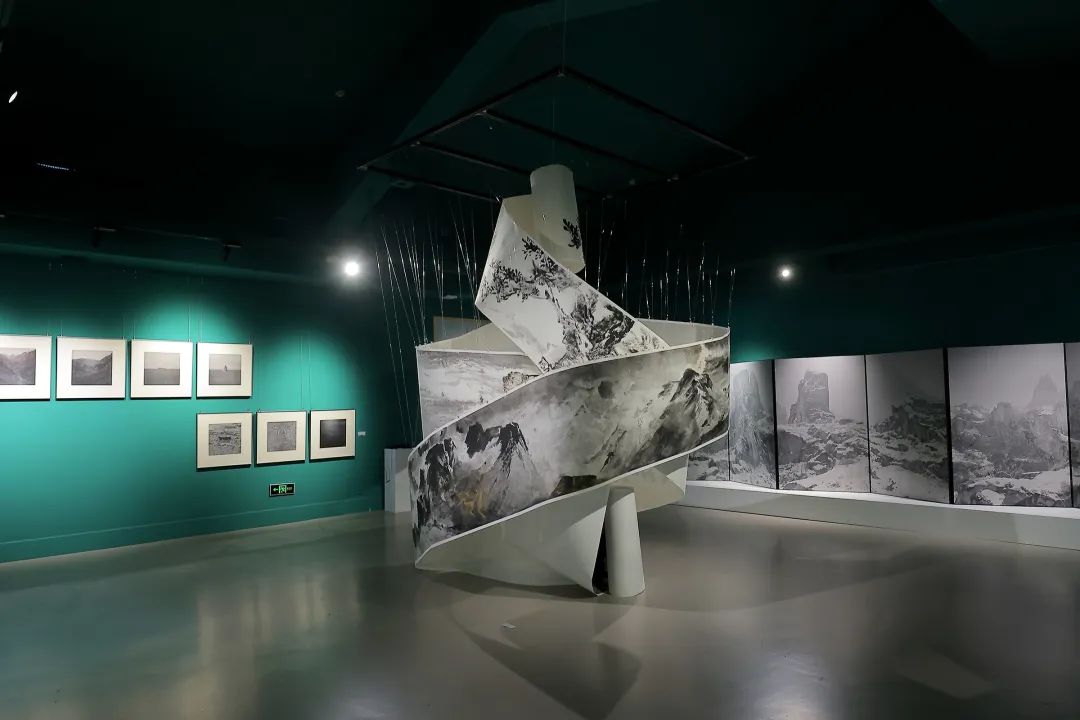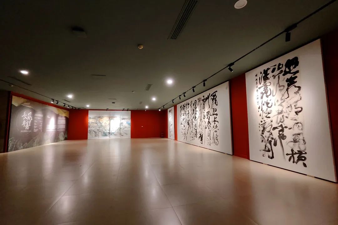 此次展览涵盖书法、国画、版画、油画、雕塑、摄影、装置、影像等多种艺术载体,展出80余位艺术家的90余件优秀作品。除过往三届唐诗之路艺术展精选作品外,展览还展示了一系列带有边塞气息的作品。是艺术家考察团前往敦煌。深入西北边塞,感受着历史文脉,创作的一批全新艺术作品。在最后一个展厅中,一件高高悬起,盘旋而落的30米长卷作品尤为抢眼。这件作品全长100米,是此次艺术家团队在沙漠中共同创作完成,描绘了三危山、黑戈壁、摇曳在风沙中的树木植被等景象,在墨色中,依稀可见五色敦煌沙砾附着其上。