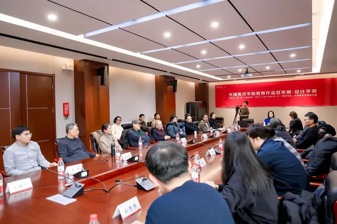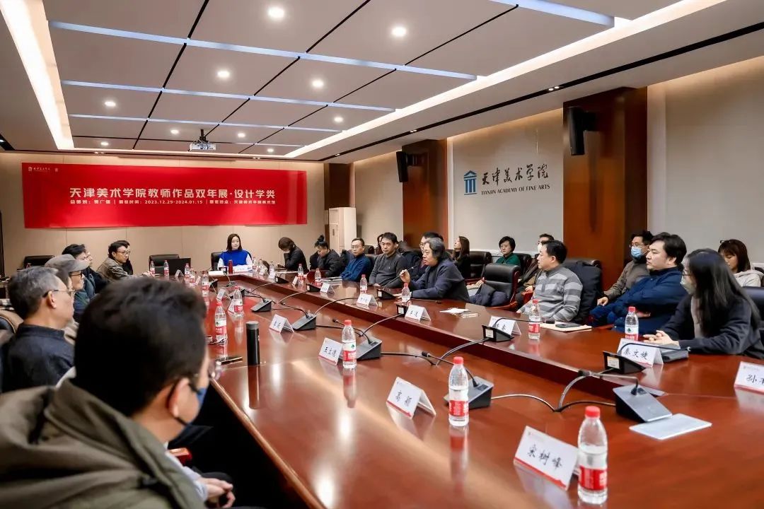 设计学类相关学院、系部负责人和教师代表,影视与传媒艺术学院院长李通教授、设计艺术学院院长高山教授、环境与建筑艺术学院副院长鲁睿教授、设计艺术学院副院长秦文婕教授、视觉传达系主任宋树峰、产品设计系主任于广琛、服装染织设计系主任王深、造型基础教育学院教师孙有强,围绕主题充分交流,为提升教师艺术创作与设计实践水平、建立设计学科设计理论体系、推动学科建设与发展建言献策。因展览效果良好,展览将延期至2024年1月30日。