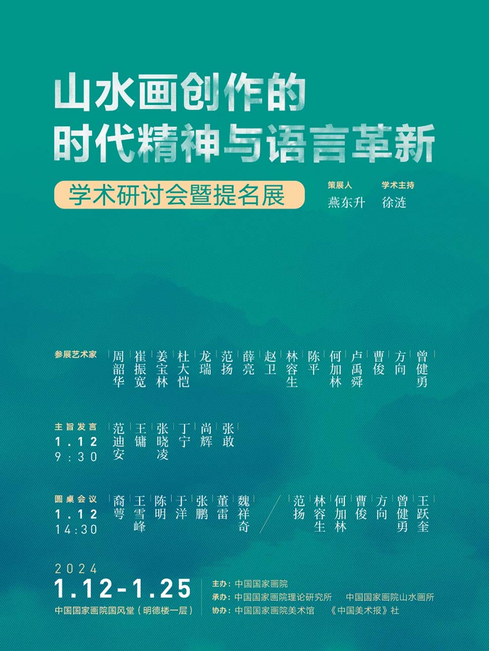 展览选取15位当代具有代表性的老中青三代山水画艺术家,力图从他们的创作实践出发,展现新时代以来,中国当代山水画创作如何在绘画语言探索与时代精神表达互为促进方面所取得的成果。