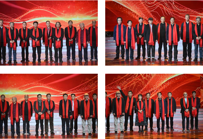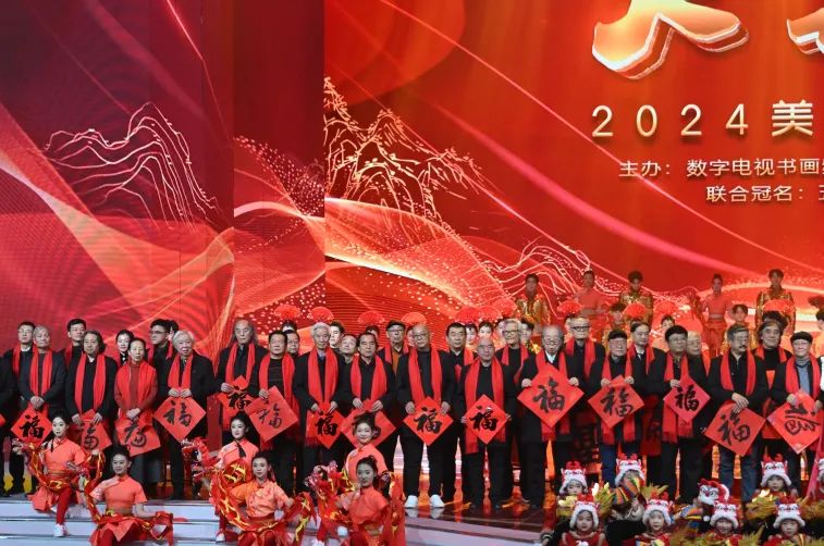 全国各地100位书画艺术名家代表同时登台,他们是书画频道中国书画艺术研究院研究员代表,同时也是2024年大美之春展览创作的艺术家,他们手举自己亲手书写的祝“福”字,为现场带来喜庆热烈节日氛围。