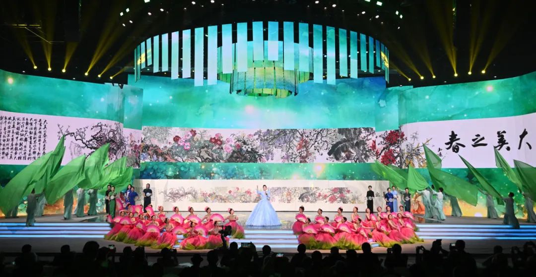 著名女高音歌唱家王喆的《大美中华》歌曲中,我们为中华大地之繁荣昌盛而感动。尤为值得一提的是,杰出女性书画艺术家代表们,参与到舞台演绎中,展示巾帼霓裳风采,谱写新时代女性新篇章!当我们徜徉在美术与文化的春天,百花争妍、大美迎春的艺术魅力给予我们无穷感动。由画家莫晓松、陈湘波、许敦平、李雪松、郑阿湃、许晓彬共同创作,冯远题款的17米巨幅花鸟画《大美之春》亮相舞台。不仅展示了春色满园的自然之美,更诉说着中国文化的智慧与追求。