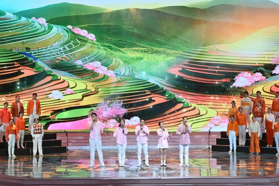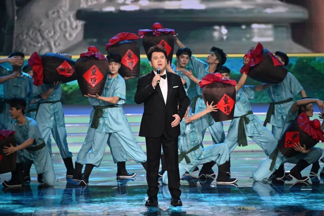 三幅由艺术名家集体创作的丈六大画,惊喜亮相舞台,他们分别是:画家杨晓阳、李宝林、尼玛泽仁、范扬、林容生带来的《青峰翠屏图》,画家卢禹舜、岳黔山、邓远坡、邢少臣创作的《群仙迎春》,以及画家张立辰、郭怡孮、吴悦石、郭石夫、徐里创作的《和堂逸兴》。艺术家代表们登台,解读画中山川与草木同歌的美妙旋律,展现了艺术家们对祖国山河万物的深沉眷恋,和对新时代美好生活的向往,并为观众送上祝福。
