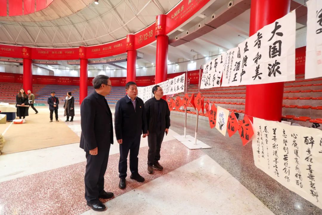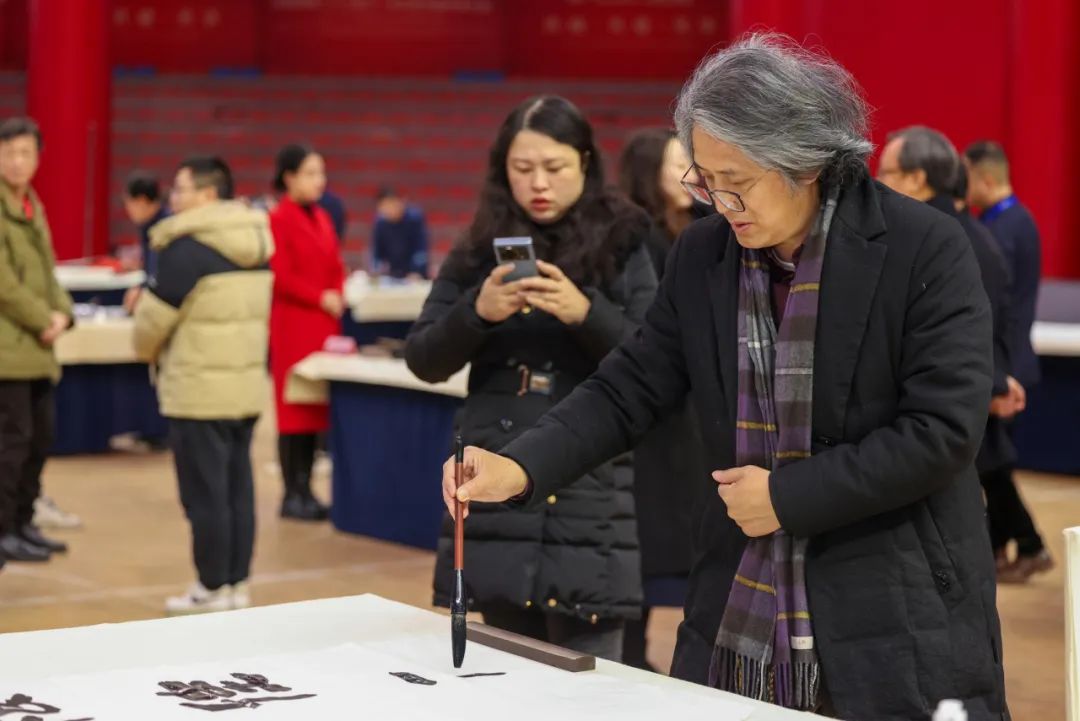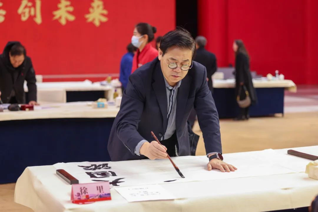 五粮液集团公司多功能厅内翰墨飘香,处处洋溢着欢乐的气氛。中国美术家协会副主席、书画频道中国书画艺术研究院院长徐里,中国书法家协会原分党组副书记、秘书长,中国人民大学教授郑晓华,中国民间文艺家协会原分党组书记、驻会副主席罗杨,中国书法家协会第五六七届理事杨明臣、四川省美术家协会主席梁时民,中国石油书法家协会主席于恩东,广西书法家协会名誉主席郑军健,中国书法家协会理事、中国金融书法家协会主席郭永琰,中国美术家协会第八届理事陈良敏,中国国家画院书法篆刻专业委员会执行主任李晓军,中国书法家协会理事、北京师范大学艺术与传媒学院书法系教邓宝剑,北京书法家协会副主席丁嘉耕,中国书法家协会女书法家委员会委员阚爱萍,在五粮液公司现场为广大的职工们饱含激情地挥毫泼墨,书写福字、春联,将美好的新春祝福凝于笔端,一幅幅喜庆吉祥的春联、一句句美好的新年祝福跃然于纸上。