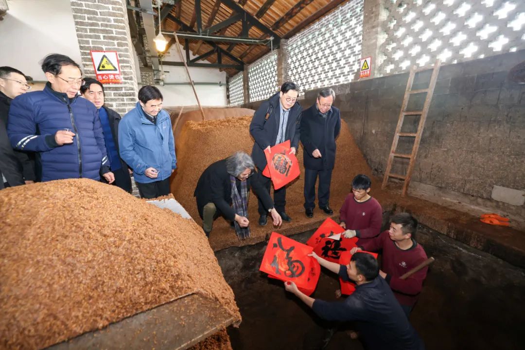 艺术家们走进有着700余年历史的酿酒古作坊501酿酒车间,探秘五粮液传承千年的古法酿艺。这里有自元明时期筑成以来700余年持续不间断酿造的古窖池,有益微生物菌群在其中不断繁衍迭代,静默生香。艺术家们沉浸式体验,品鉴车间现场摘出的原酒,感受五粮美酒的醇厚口感,赞叹于“大国浓香”的极致品质追求。艺术家们走进窖池,向正在工作的一线工人们,送上了新春的祝福。