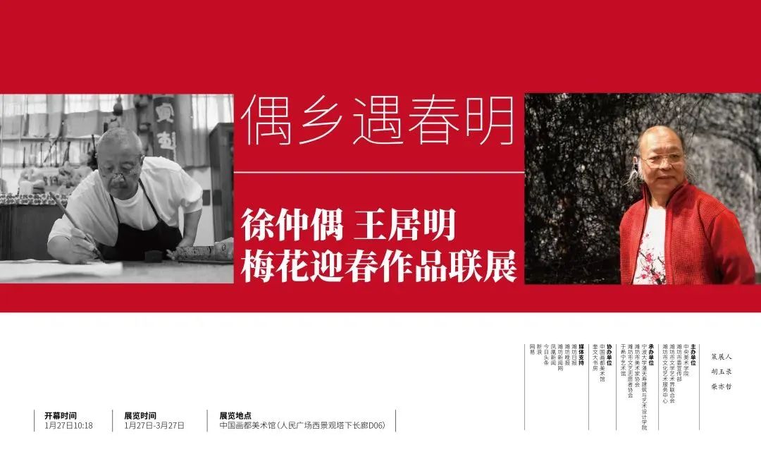由中央美术学院,潍坊市委宣传部,潍坊市文学艺术联合会,潍坊市文化艺术服务中心联合主办的偶乡遇春明——徐仲偶 王居明梅花迎春作品联展在潍坊市文化艺术中心中国画都美术馆举办。