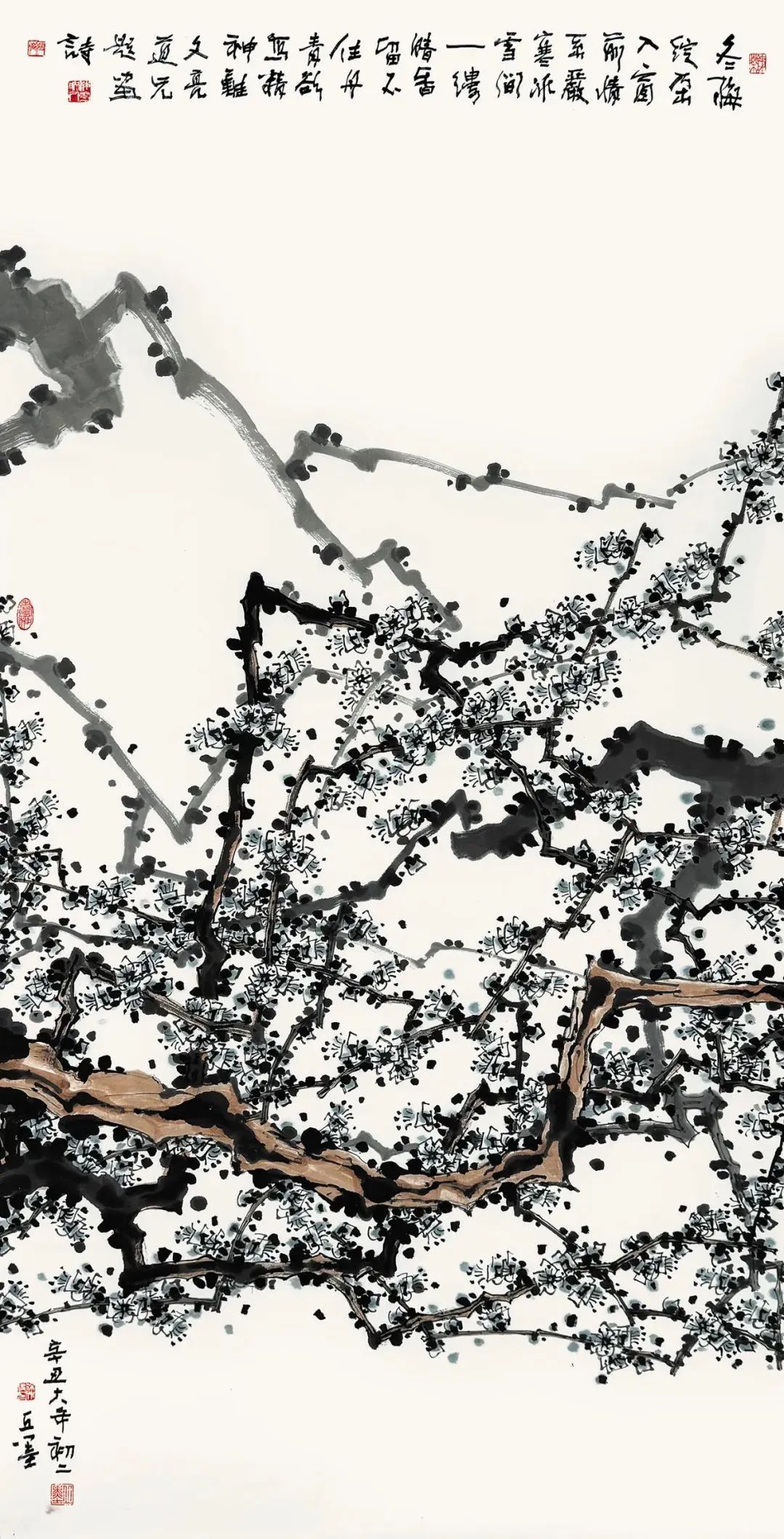 徐仲偶笔下的梅花清秀灵动,线条间穿插有度,画面充满了韵律感和设计感。他巧妙地将早年创作和空间设计感悟,融入中国书画的本土语言之中,创造性地将西方创作手法与中国书法的抽象意味相结合,表达创作者的自然心象,为梅花这一中国传统艺术主题注入了新的生命力。并以写意的手法,展现梅树枝干的蜿蜒苍劲与梅花的清新秀丽,独树一帜。他的艺术风格和表达方式,为后来的梅花创作提供了新的思路和启迪。