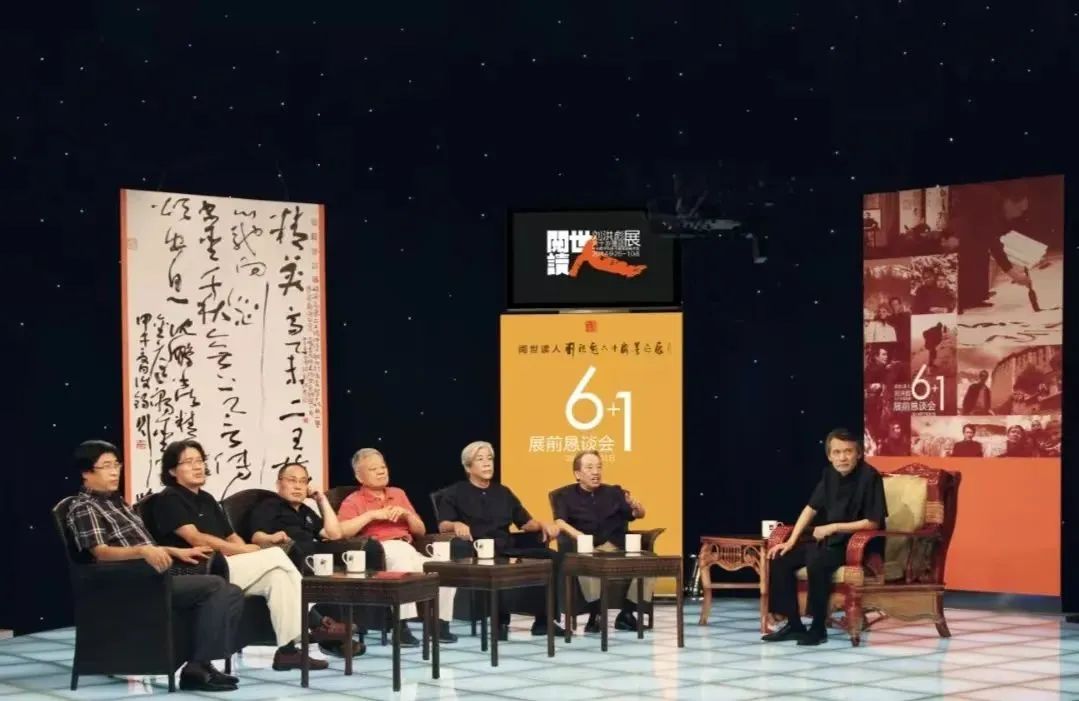 阅世读人·刘洪彪六十岁墨迹展6+1展前恳谈会。右起:刘洪彪、申万胜、白煦、胡抗美、朱培尔、郑晓华、张继(2014年)