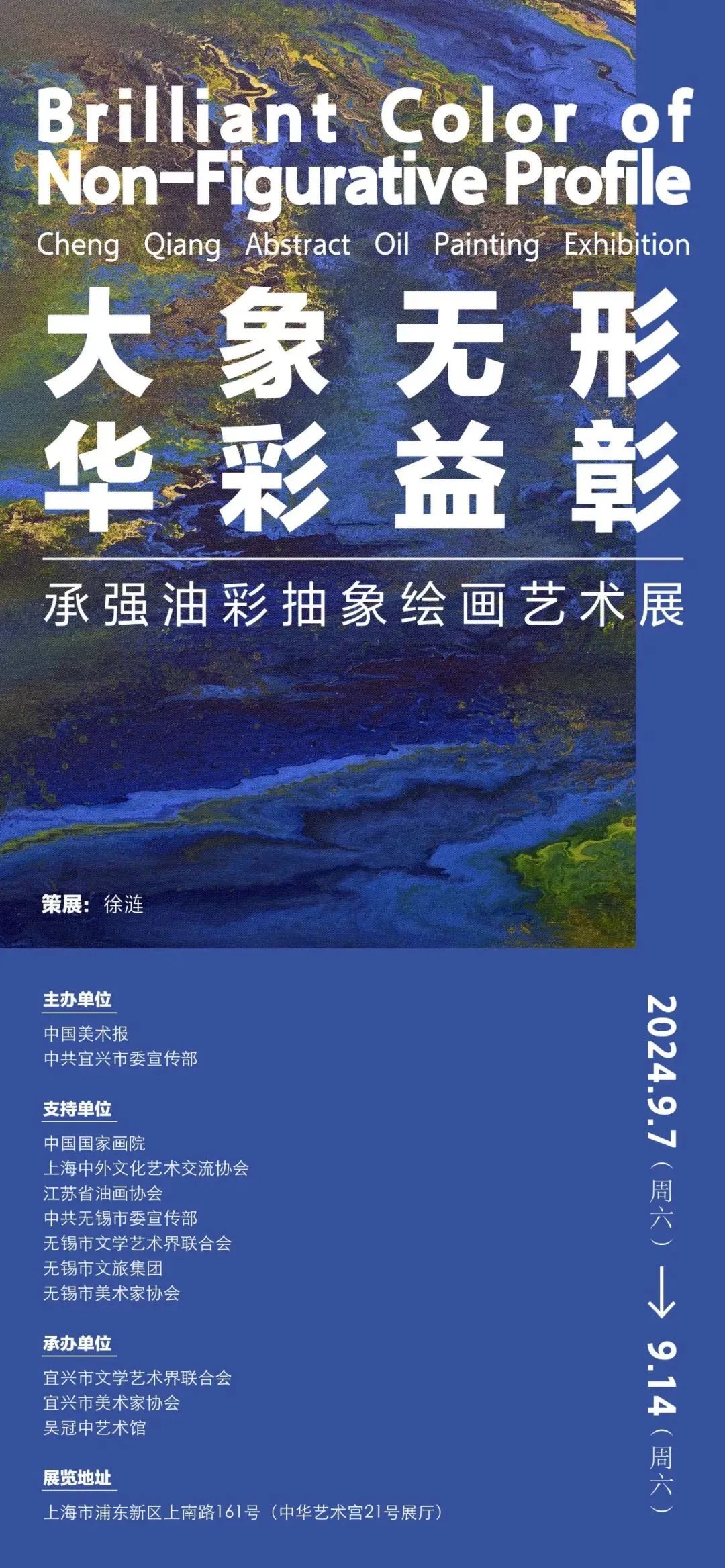 由《中国美术报》社、中共宜兴市委宣传部主办的“大象无形 华彩益彰——承强油彩抽象绘画艺术展”在上海中华艺术宫开幕。承强是江苏宜兴人,宜兴市美术家协会主席,吴冠中艺术馆馆长。展览展出其创作的抽象油彩作品80余幅。画家承强通过色彩、线条和形状的组合,不拘泥于自然的外在形式,构建出富有想象力的画面,其作品充溢着东方审美韵味和奇伟磅礴的中国气象。