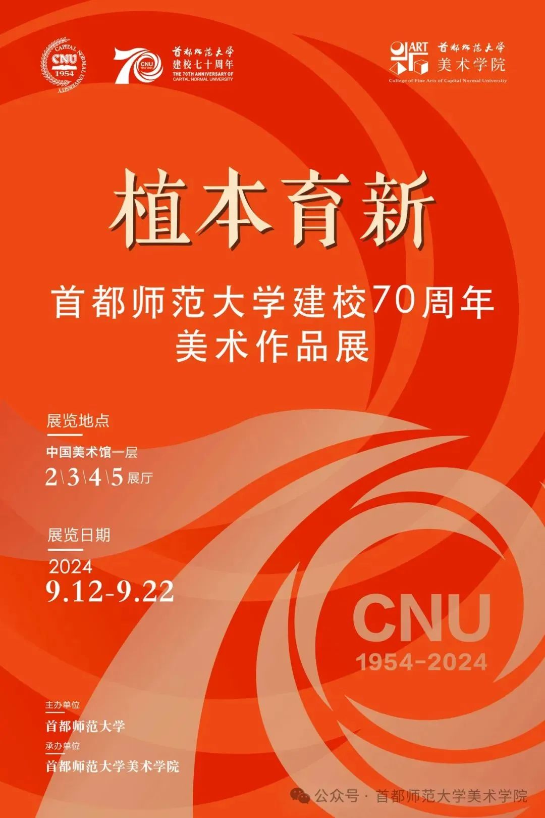七秩风华,植本育新,9月14日,由首都师范大学主办的植本育新——首都师范大学建校70周年美术作品展,在中国美术馆开展。本次展览分为“学脉溯源”“气象大观”“桃李灼华”三个版块,全面展现学校美术学科自辅仁大学肇始,各个历史阶段的发展进程、创作业绩与育人成果,不仅是对学脉源流与发展轨迹的系统梳理,更是对学科进一步强基创新的期许与展望。