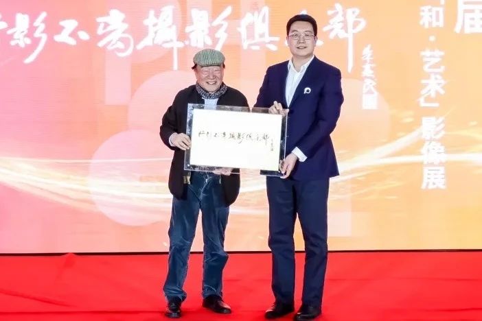 朱宪民为“行影不离”摄影俱乐部授牌,和·艺术馆副馆长王冬上台接牌