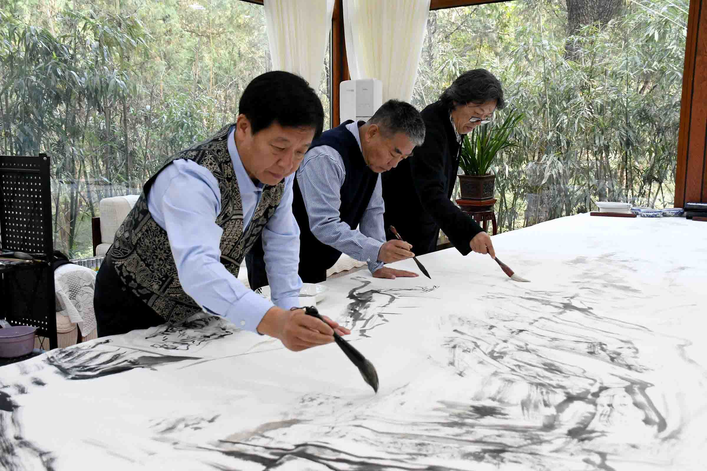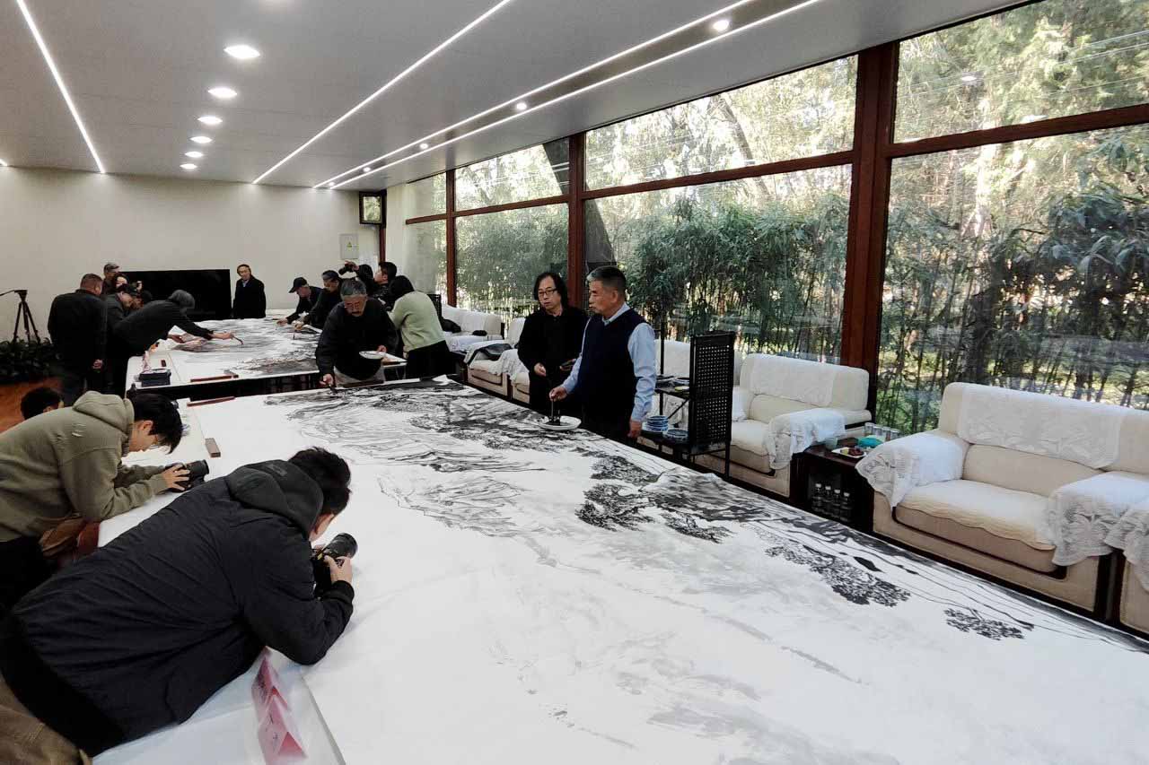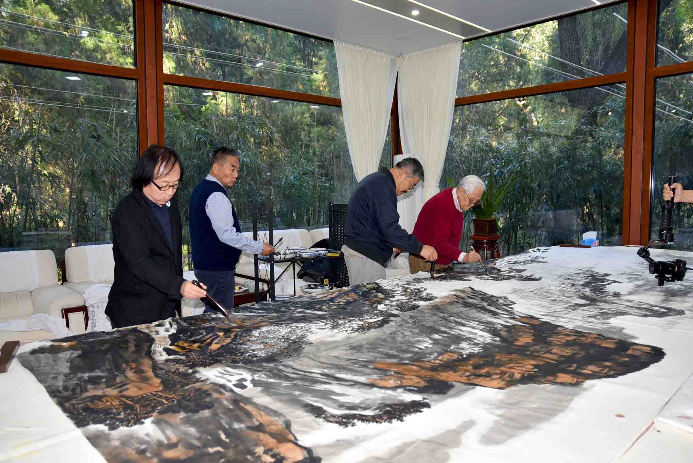 山水巨制《太行雄姿》以其传统笔墨功夫与现代表现手法的结合充分体现了太行山的雄姿与柔美、刚烈与滋润,赋予了太行山一种鲜活的生命力。各位艺术家们将自己独具个性的笔墨特点融合于这幅太行山创作之中,为我们呈现出蔚为壮观的太行景象,令观者回味无穷。在创作现场,艺术家们徜徉在笔墨之中,思考着如何用不同的笔墨形式去表现太行山的美,如何充满笔墨情趣又不局限于程式化限定,如何抓住独特的意境美特质让景物生动鲜活,正是这样的思考赋予了这件作品鲜活的生命力。
