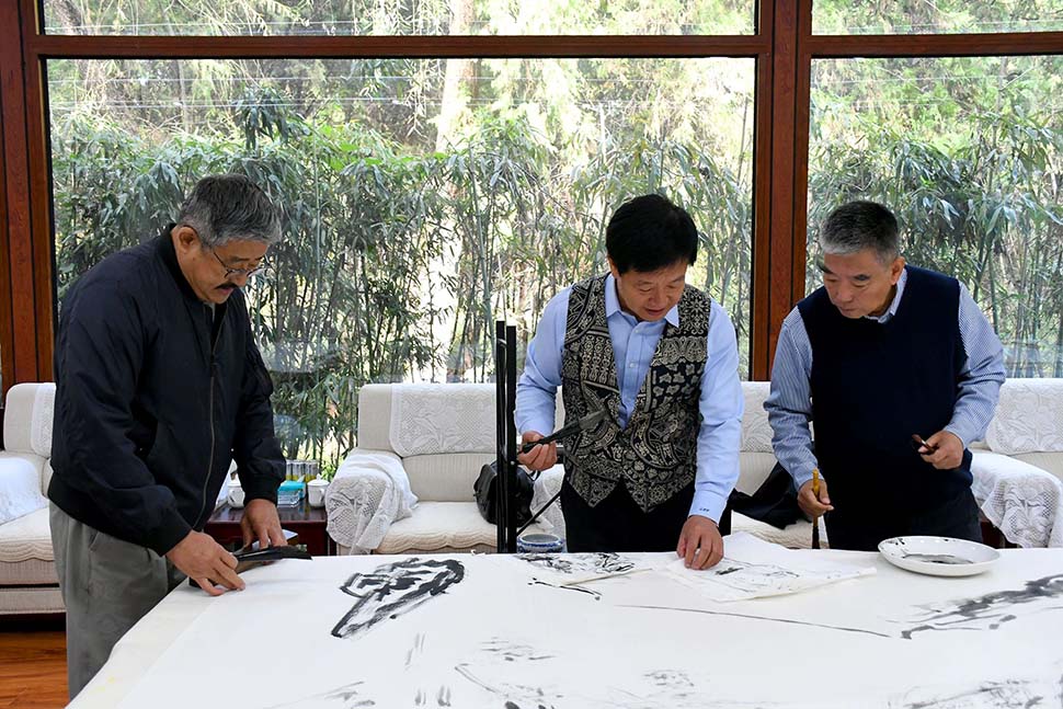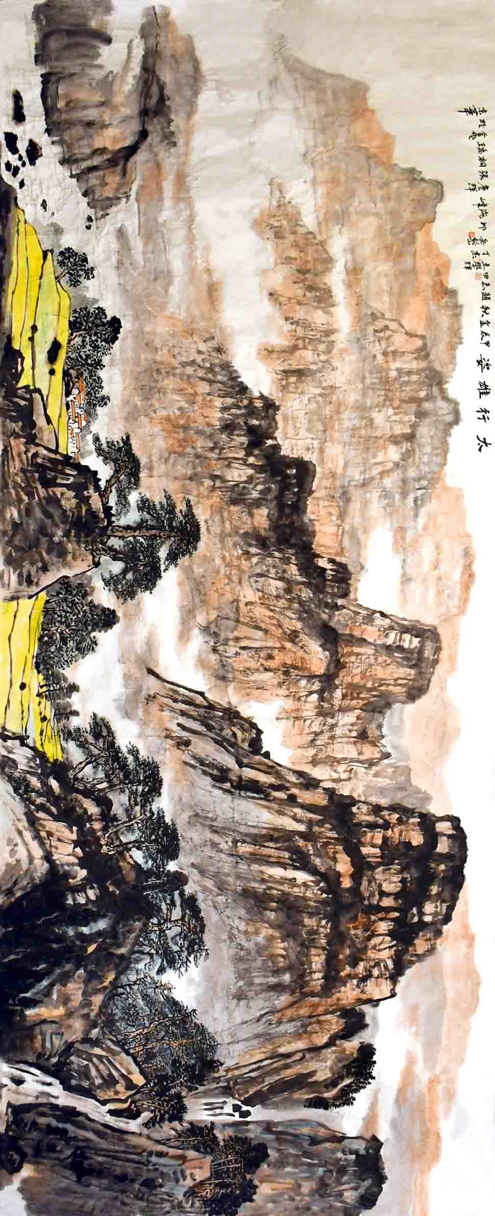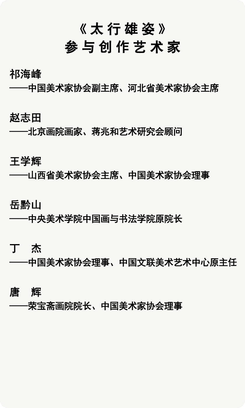 山水巨制《太行雄姿》以其传统笔墨功夫与现代表现手法的结合充分体现了太行山的雄姿与柔美、刚烈与滋润,赋予了太行山一种鲜活的生命力。各位艺术家们将自己独具个性的笔墨特点融合于这幅太行山创作之中,为我们呈现出蔚为壮观的太行景象,令观者回味无穷。在创作现场,艺术家们徜徉在笔墨之中,思考着如何用不同的笔墨形式去表现太行山的美,如何充满笔墨情趣又不局限于程式化限定,如何抓住独特的意境美特质让景物生动鲜活,正是这样的思考赋予了这件作品鲜活的生命力。