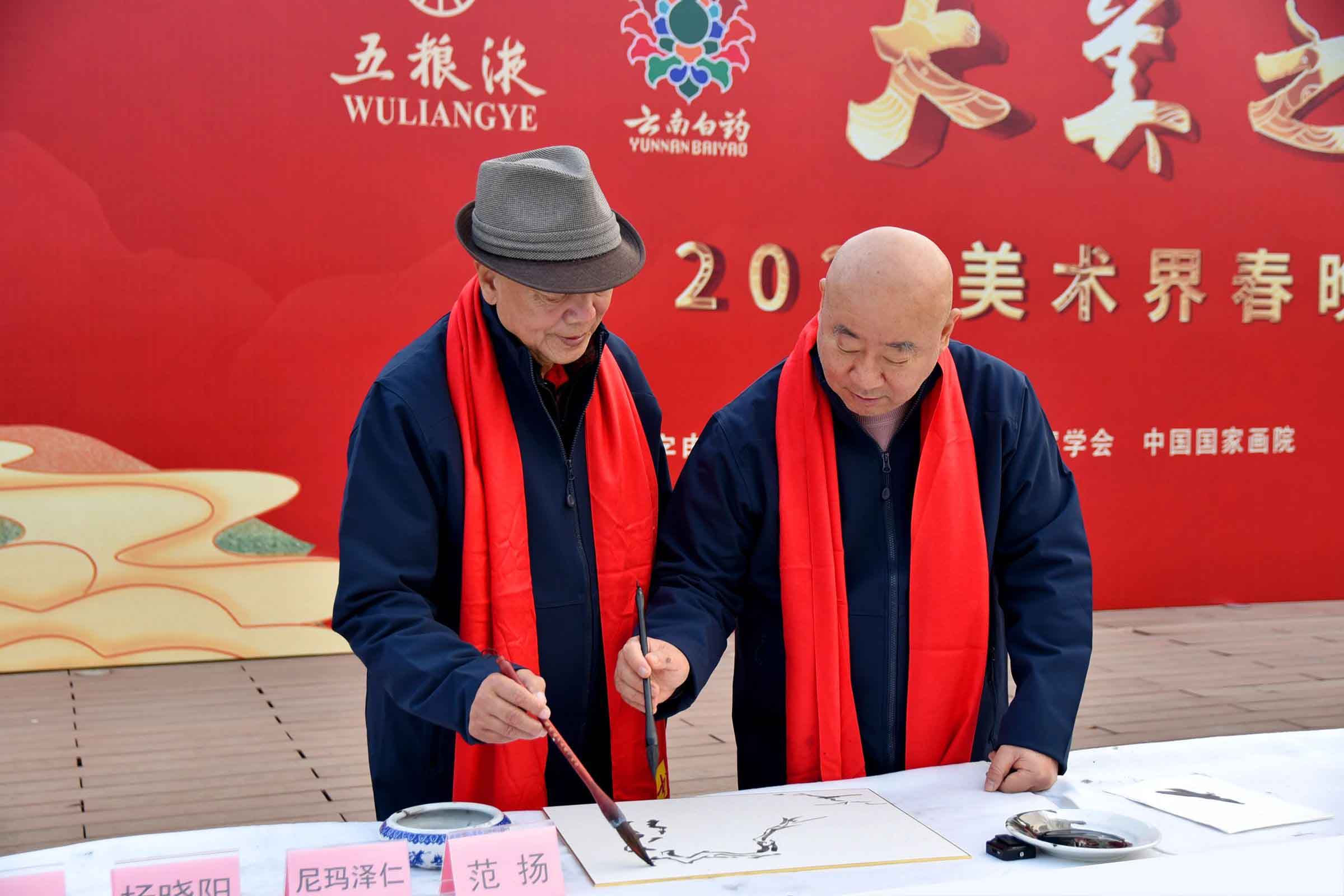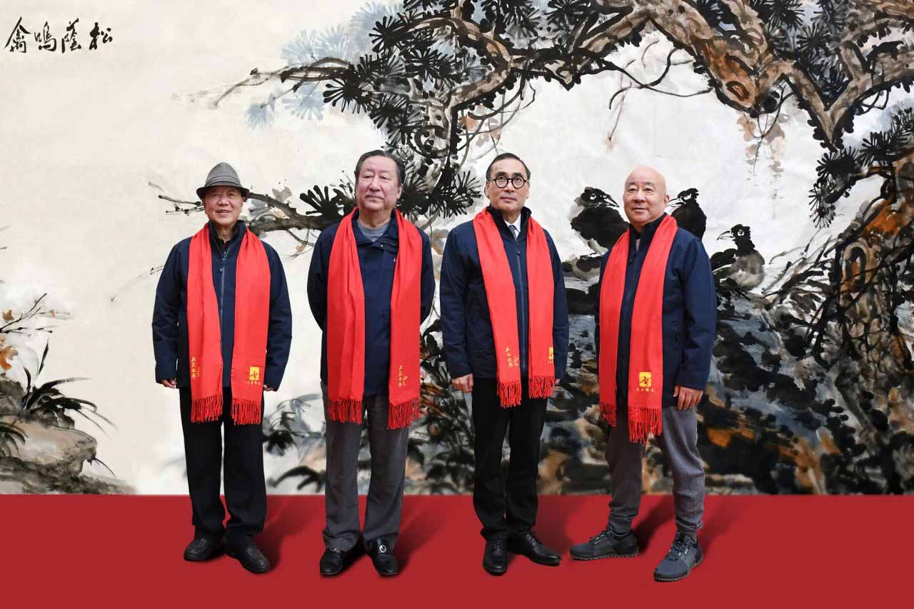 中国国家画院院长刘万鸣、中国文化艺术发展促进会主席杨晓阳、中国美术家协会顾问尼玛泽仁、中国国家画院国画院原副院长范扬共同创作完成花鸟画巨制《松荫鸣禽》。这幅作品以粗犷劲健的大写意笔触勾勒出松荫下禽鸟和谐的自然野趣,其艺术表达令入叹为观止。欣赏这幅作品时,人们仿佛能够感受到生命的美妙和艺术家们的心灵碰撞,画面既在表现形式上贴近广大人民的审美趣味,传达对美好生活的向往,又寓意文脉相承、文化发展的时代要求。