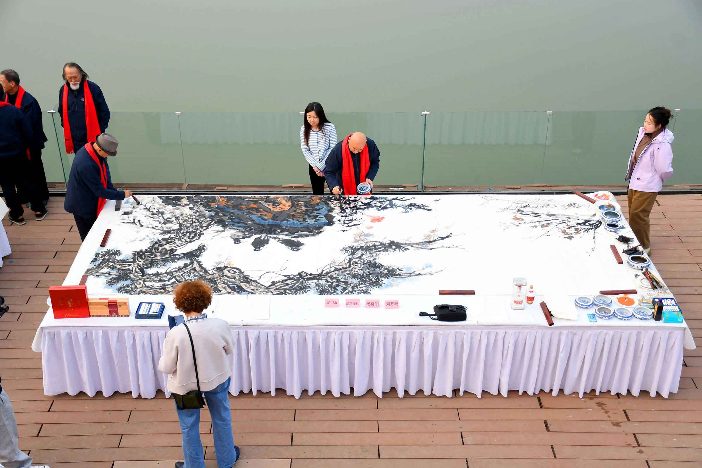 创作现场,诸位画家合力探讨主题内容、构思立意,力求将不同画家的笔墨特点、艺术风格和谐地融合在一起,以开放包容的姿态展现“各美其美,美人之美,美美与共,天下大同”的和美精神,向广大观众传达着“大美之春”所倡导的艺术主旨。