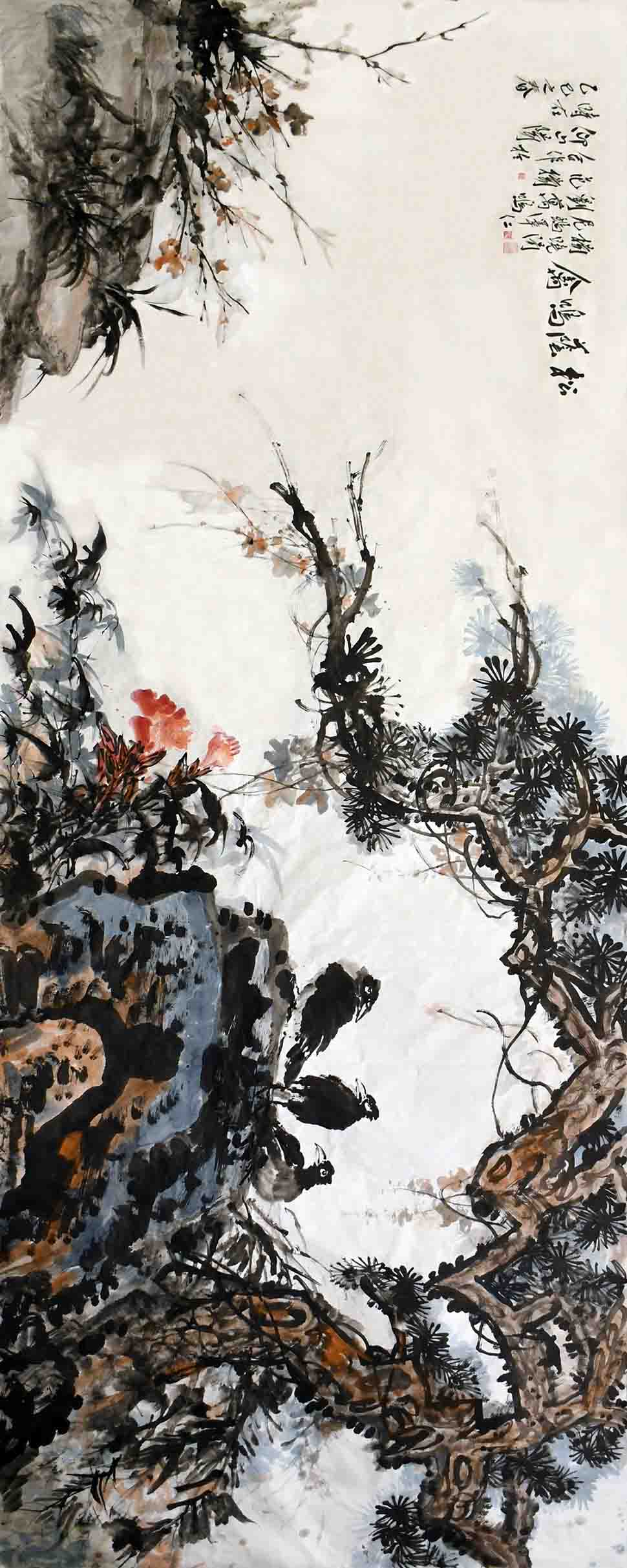杨晓阳、刘万鸣、尼玛泽仁、范扬共同创作大幅花鸟画《松荫鸣禽》