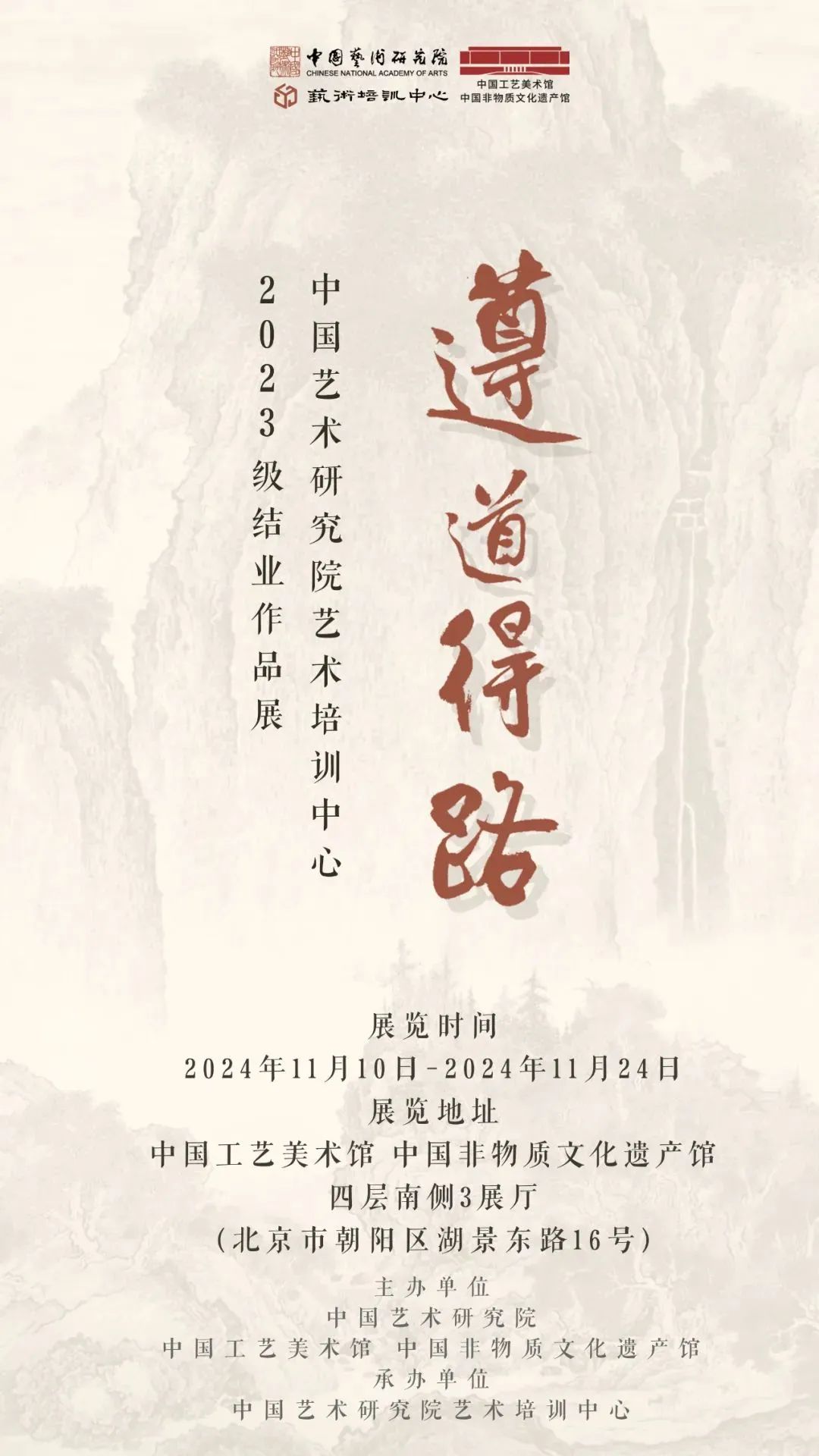 11月13日,由中国艺术研究院、中国工艺美术馆(中国非物质文化遗产馆)主办的中国艺术研究院艺术培训中心“遵道得路—2023级结业典礼暨结业作品展”在中国工艺美术馆(中国非物质文化遗产馆)举行。此次结业展典礼采取线上与线下相结合的方式进行。来自中国艺术研究院、中国工艺美术馆相关职能部门、研究所负责人,以及艺术培训中心导师、学员代表、教职员工近200人参加线下典礼。