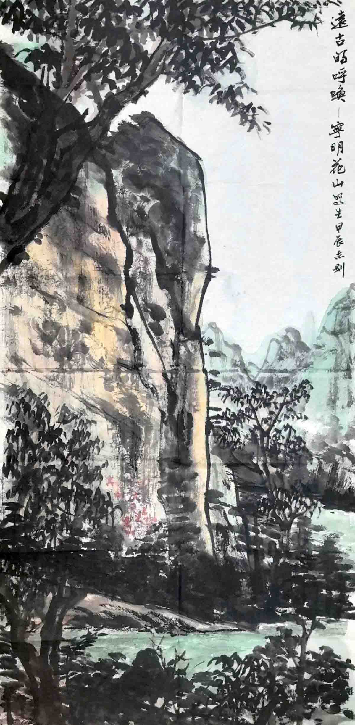 “花山”壮语称为“岜莱”,意思是有画的山。在崇左市,凡被称为“花山”者,崖壁上均绘有岩画,岩画点大都位于江河的拐弯处,面向来水的高大峭壁上,独特的选址使岩画与山崖、河流、台地共同构成一个相对封闭神秘的景观场域。左江花山岩画文化景观绵延数百里,位于崇左市宁明县的花山岩画,单位面积最大、画面最集中、内容最丰富、保存最完好,是左江花山岩画的典型代表。原始、宏大的图案犹如一幅生动的历史画卷,诉说着千年文脉的传承。书画家们细细品味岩画的图案,在心中勾勒出古人的生活场景与精神世界,悠悠江水拍打堤岸,时空的画笔仿佛凝结于此。书画名家们为古朴、粗犷的岩画所震撼,纷纷拿出画笔,用笔墨描绘着中华文明的博大精深与绵延不绝的生命力。