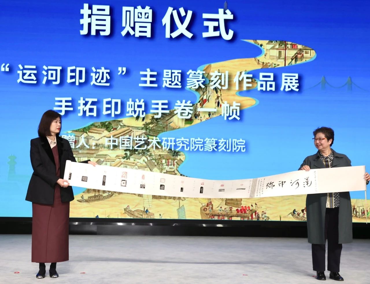 中国艺术研究院篆刻院名誉院长骆芃芃上台向扬州中国大运河博物馆捐赠了“运河印迹”主题篆刻作品展部分作者创作的手拓印蜕手卷一帧和由其本人镌刻的“守河人”印章一枚,扬州中国大运河博物馆馆长郑晶接受了捐赠并授予捐赠收藏证书。