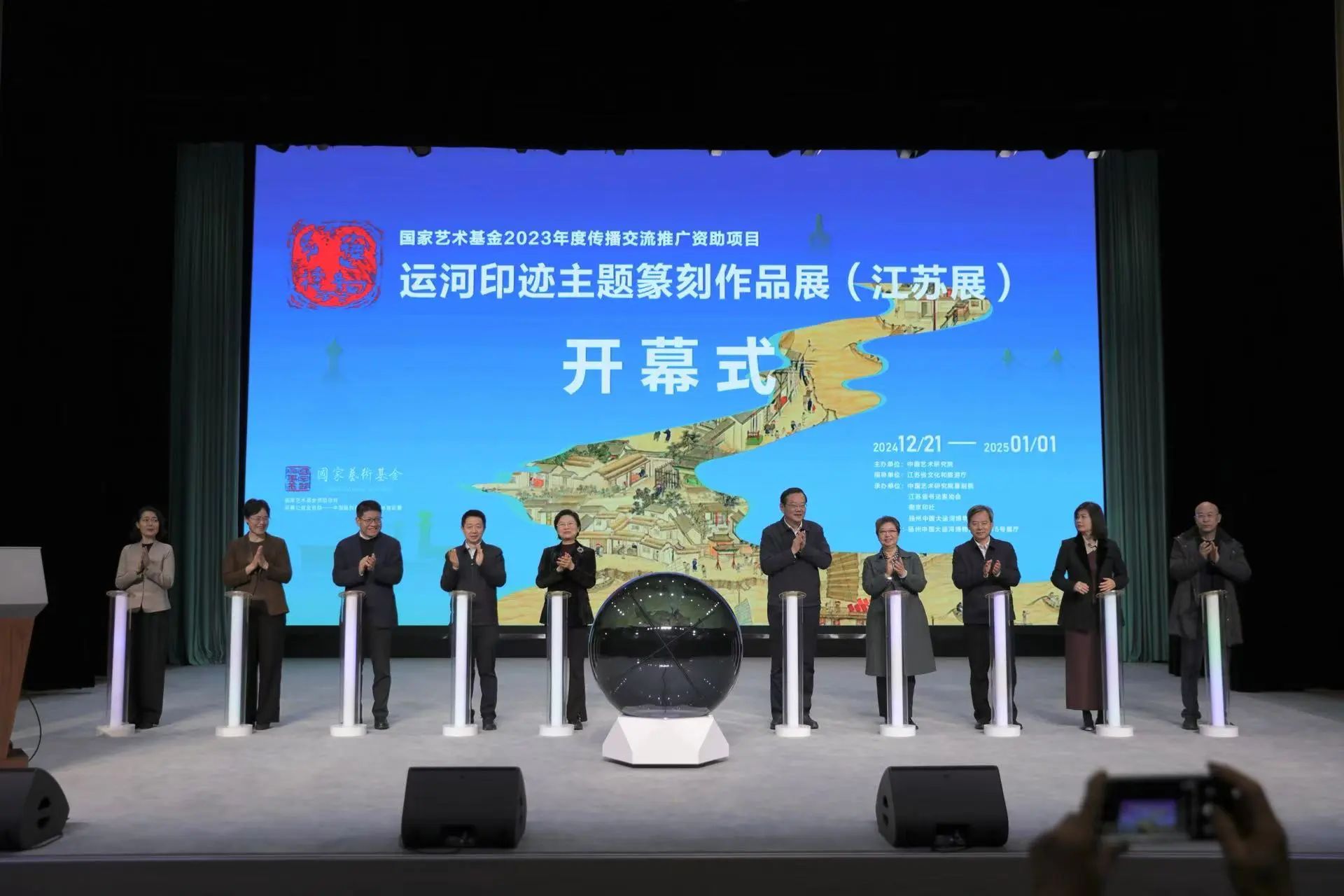 江苏省委宣传部副部长徐宁,扬州市政协主席陈扬,中国艺术研究院党委书记王洪俊,中国艺术研究院篆刻院名誉院长骆芃芃,江苏省文化和旅游厅副厅长拾峰,江苏省文学艺术界联合会副主席刘轩明,扬州市委常委、宣传部部长张长金,扬州中国大运河博物馆馆长郑晶,扬州市副市长刘流,南京印社社长仇高驰,共同登台为运河印迹主题篆刻作品展(江苏展)启幕。